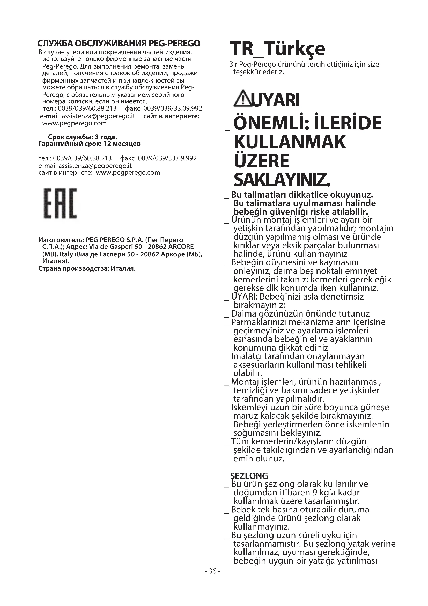 KULLANMAK ÜZERE SAKLAYINIZ. _ Bu talimatları dikkatlice okuyunuz. Bu talimatlara uyulmaması halinde bebeğin güvenliği riske atılabilir. _ Ürünün montaj işlemleri ve ayarı bir yetişkin tarafından yapılmalıdır; montajın düzgün yapılmamış olması ve üründe kırıklar veya eksik parçalar bulunması halinde, ürünü kullanmayınız _ Bebeğin düşmesini ve kaymasını önleyiniz; daima beş noktalı emniyet kemerlerini takınız; kemerleri gerek eğik gerekse dik konumda iken kullanınız. _ UYARI: Bebeğinizi asla denetimsiz bırakmayınız; _ Daima gözünüzün önünde tutunuz _ Parmaklarınızı mekanizmaların içerisine geçirmeyiniz ve ayarlama işlemleri esnasında bebeğin el ve ayaklarının konumuna dikkat ediniz _ İmalatçı tarafından onaylanmayan aksesuarların kullanılması tehlikeli olabilir. _ Montaj işlemleri, ürünün hazırlanması, temizliği ve bakımı sadece yetişkinler tarafından yapılmalıdır. _ İskemleyi uzun bir süre boyunca güneşe maruz kalacak şekilde bırakmayınız. Bebeği yerleştirmeden önce iskemlenin soğumasını bekleyiniz. _ Tüm kemerlerin/kayışların düzgün şekilde takıldığından ve ayarlandığından emin olunuz. ŞEZLONG _ Bu ürün şezlong olarak kullanılır ve doğumdan itibaren 9 kg’a kadar kullanılmak üzere tasarlanmıştır. _ Bebek tek başına oturabilir duruma geldiğinde ürünü şezlong olarak kullanmayınız. _ Bu şezlong uzun süreli uyku için tasarlanmamıştır. Bu şezlong yatak yerine kullanılmaz, uyuması gerektiğinde, bebeğin uygun bir yatağa yatırılması СЛУЖБА ОБСЛУЖИВАНИЯ PEG-PEREGO В случае утери или повреждения частей изделия, используйте только фирменные запасные части Peg-Perego. Для выполнения ремонта, замены деталей, получения справок об изделии, продажи фирменных запчастей и принадлежностей вы можете обращаться в службу обслуживания Peg- Perego, с обязательным указанием серийного номера коляски, если он имеется. тел.: 0039/039/60.88.213 факс 0039/039/33.09.992 e-mail assistenza@pegperego.it сайт в интернете: www.pegperego.com Срок службы: 3 года. Гарантийный срок: 12 месяцев тел.: 0039/039/60.88.213 факс 0039/039/33.09.992 e-mail assistenza@pegperego.it сайт в интернете: www.pegperego.com Изготовитель: PEG PEREGO S.P.A. (Пег Перего С.П.А.); Адрес: Via de Gasperi 50 - 20862 ARCORE (MB), Italy (Виа де Гаспери 50 - 20862 Аркоре (МБ),