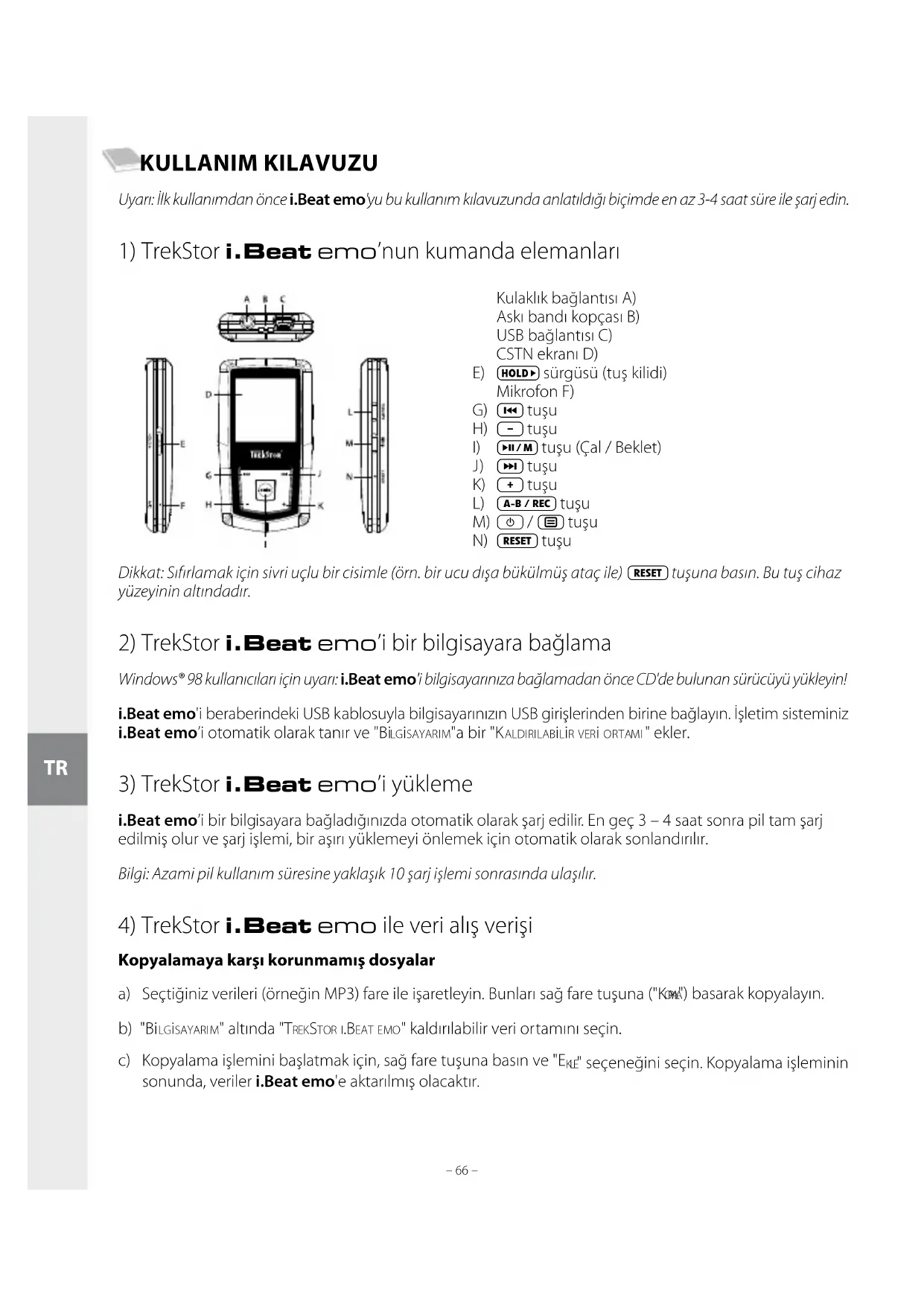 – 67 – KULLANIM KILAVUZU Uyarı: İlk kullanımdan önce i.Beat emo'yu bu kullanım kılavuzunda anlatıldığı biçimde en az 3-4 saat süre ile şarj edin.
