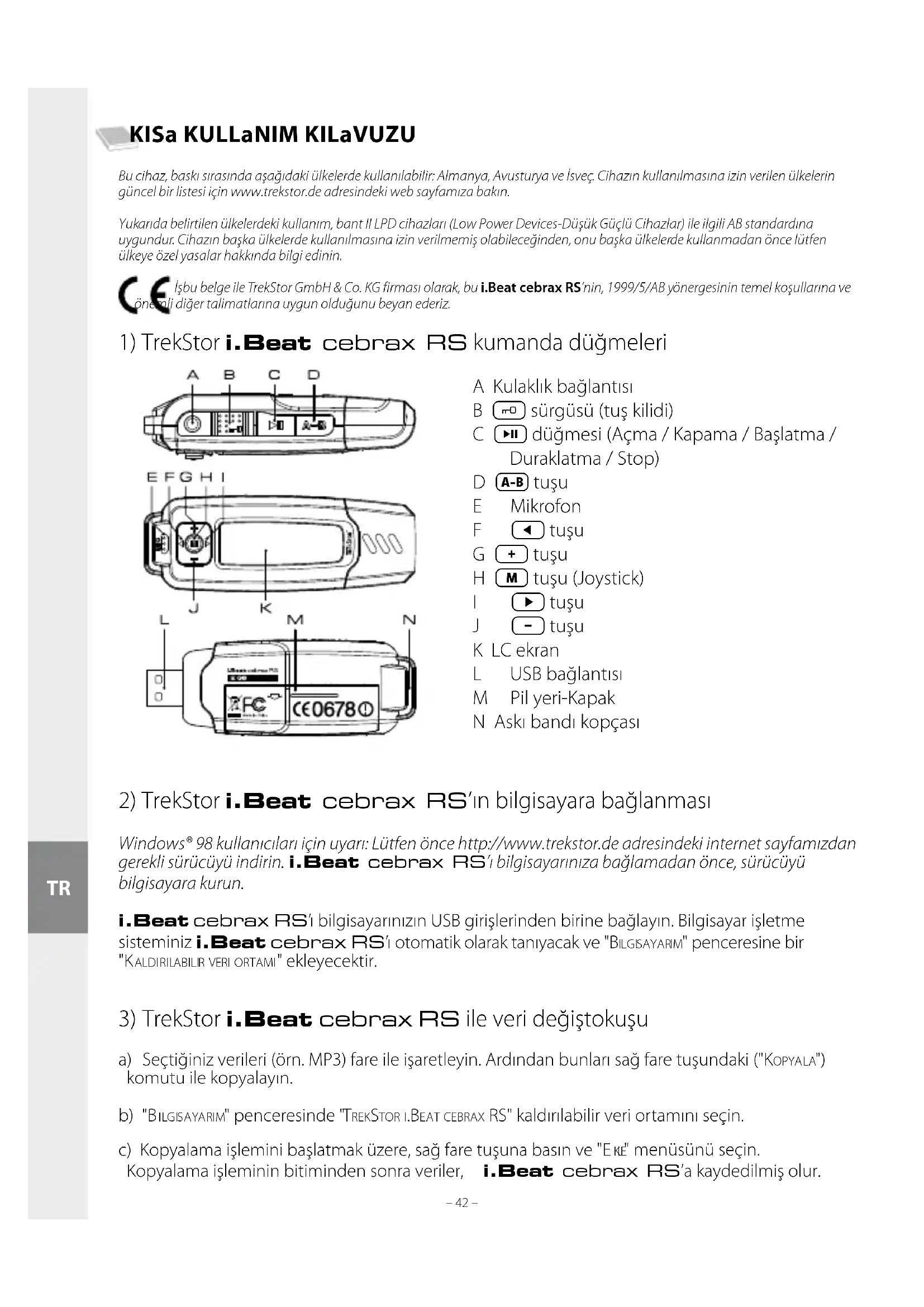 a) Seçtiğiniz verileri (örn. MP3) fare ile işaretleyin. Ardından bunları sağ fare tuşundaki ("Ko p y A l A ") komutu ile kopyalayın. b) "b i lg is A yA ri m" penceresinde "tr e K st o r i.be A t c e b r A x rs" kaldırılabilir veri ortamını seçin. c) Kopyalama işlemini başlatmak üzere, sağ fare tuşuna basın ve "e K l e " menüsünü seçin. Kopyalama işleminin bitiminden sonra veriler, i.Beat cebrax RS’a kaydedilmiş olur. A Kulaklık bağlantısı B sürgüsü (tuş kilidi) C düğmesi (Açma / Kapama / Başlatma / Duraklatma / Stop) D tuşu E Mikrofon F tuşu G tuşu H tuşu (Joystick) I tuşu J tuşu K LC ekran L USB bağlantısı M Pil yeri-Kapak N Askı bandı kopçası TR– 42 – – 43 –