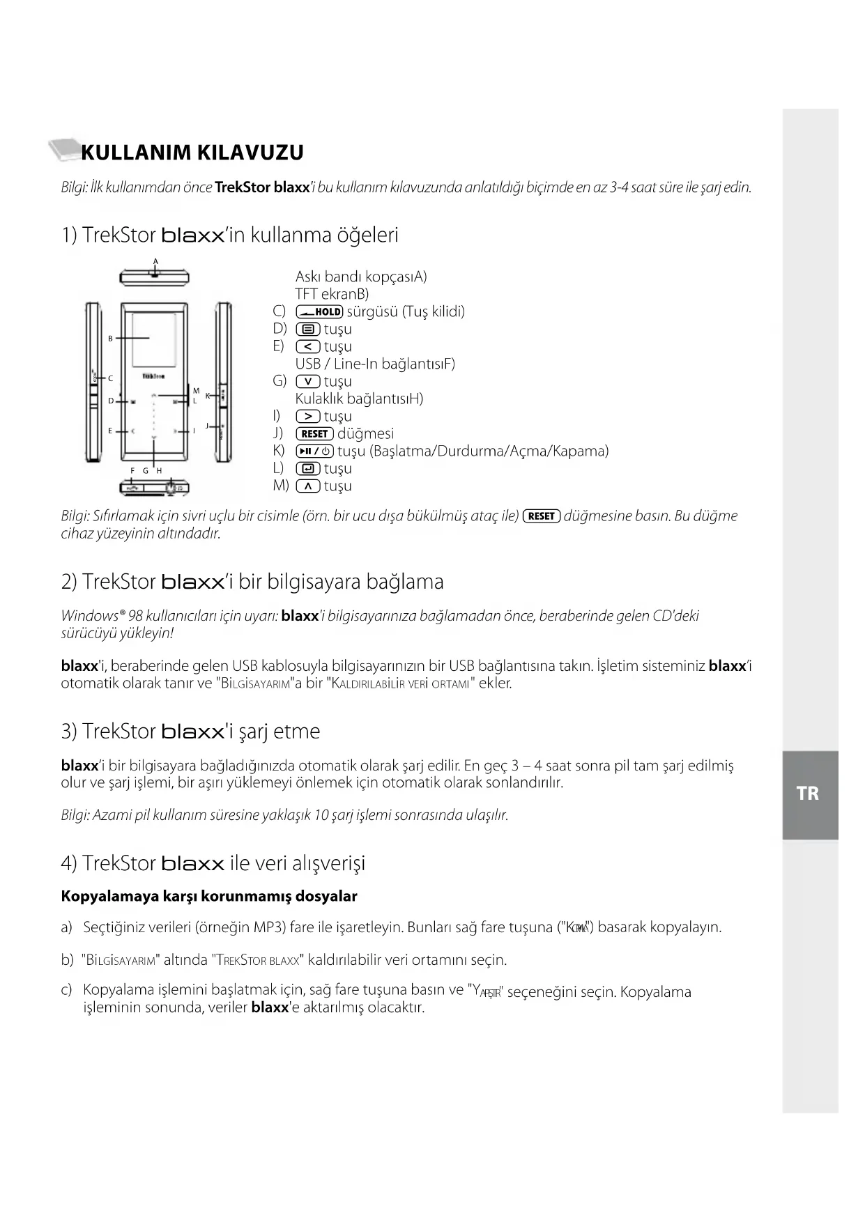 KULLANIM KILAVUZU Bilgi: İlk kullanımdan önce TrekStor blaxx'i bu kullanım kılavuzunda anlatıldığı biçimde en az 3-4 saat süre ile şarj edin.