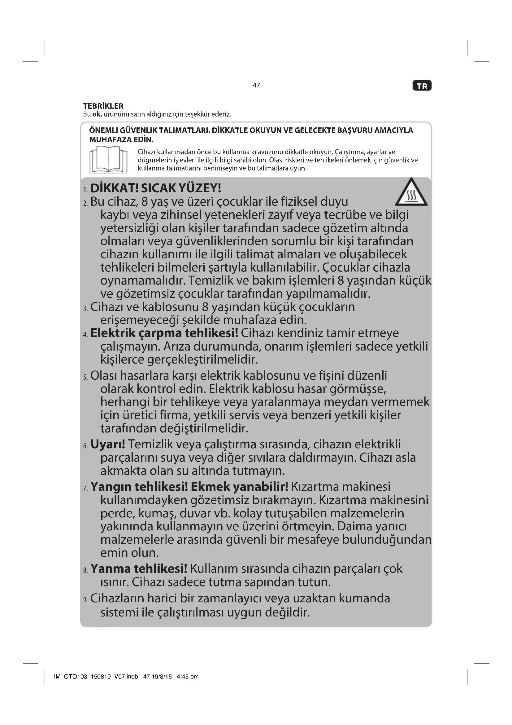 Dikkat - Kizartma icin tipik ekmek Çesitleri kullanımadında yanma sehlikesi. Dahakıçıkediting veya sekil nedeniyle, kizartilan ekmeği disari alirken sicalsk parçalara dokunma sehlikesivardir.