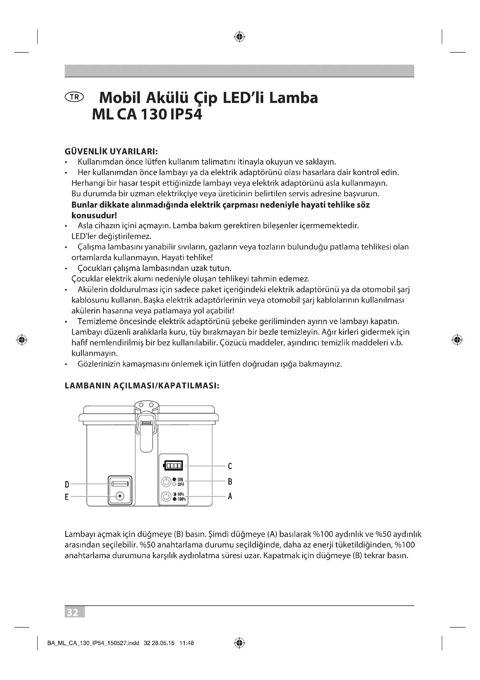 - Gözlerinizinkamaşmasınıönlemekiçinlütfendoğrudanışığabakmayınız. LAMBANIN AÇILMASI/KAPATILMASI: Lambayıaçmakiçindüğmeye(B)basın.Şimdidüğmeye(A)basılarak%100aydınlıkve%50aydınlık arasındanseçilebilir.%50anahtarlamadurumuseçildiğinde,dahaazenerjitüketildiğinden,%100 anahtarlamadurumunakarşılıkaydınlatmasüresiuzar.Kapatmakiçindüğmeye(B)tekrarbasın.