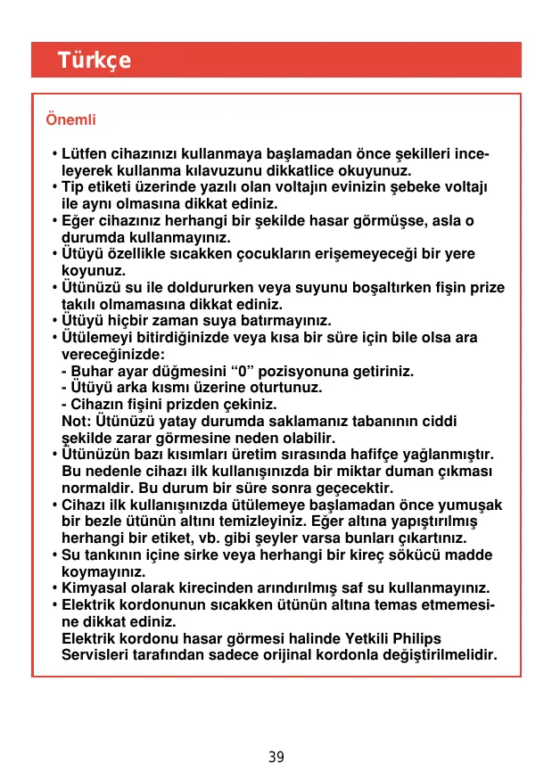 - Elektrik kordonunun s›cakken ütünün alt›na temas etmemesine dikkat ediniz. Elektrik kordonu hasar görmesi halinde Yetkili Philips Servisleri taraf›ndan sadece orijinal kordonla de¤ifltirilmelidir.