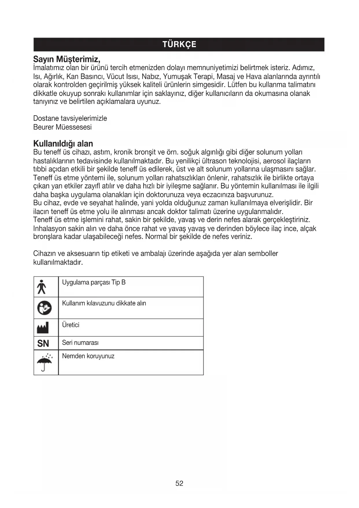 Sayın Müşterimiz, İmalatımız olan bir ürünü tercih etmenizden dolayı memnuniyetimizi belirtmek isteriz. Adımız, Isı, Ağırlık, Kan Basıncı, Vücut Isısı, Nabız, Yumuşak Terapi, Masaj ve Hava alanlarında ayrıntılı olarak kontrolden geçirilmiş yüksek kaliteli ürünlerin simgesidir. Lütfen bu kullanma talimatını dikkatle okuyup sonrakı kullanımlar için saklayınız, diğer kullanıcıların da okumasına olanak tanıyınız ve belirtilen açıklamalara uyunuz. Dostane tavsiyelerimizle Beurer Müessesesi Kullanıldığı alan Bu tene üs cihazı, astım, kronik bronşit ve örn. soğuk algınlığı gibi diğer solunum yolları hastalıklarının tedavisinde kullanılmaktadır. Bu yenilikçi ültrason teknolojisi, aerosol ilaçların tıbbi açıdan etkili bir şekilde tene üs edilerek, üst ve alt solunum yollarına ulaşmasını sağlar. Tene üs etme yöntemi ile, solunum yolları rahatsızlıkları önlenir, rahatsızlık ile birlikte ortaya çıkan yan etkiler zayı atılır ve daha hızlı bir iyileşme sağlanır. Bu yöntemin kullanılması ile ilgili daha başka uygulama olanakları için doktorunuza veya eczacınıza başvurunuz. Bu cihaz, evde ve seyahat halinde, yani yolda olduğunuz zaman kullanılmaya elverişlidir. Bir ilacın tene üs etme yolu ile alınması ancak doktor talimatı üzerine uygulanmalıdır. Tene üs etme işlemini rahat, sakin bir şekilde, yavaş ve derin nefes alarak gerçekleştiriniz. Inhalasyon sakin alın ve daha önce rahat ve yavaş yavaş ve derinden böylece ilaç ince, alçak bronşlara kadar ulaşabileceği nefes. Normal bir şekilde de nefes veriniz. Cihazın ve aksesuarın tip etiketi ve ambalajı üzerinde aşağıda yer alan semboller kullanılmaktadır. Uygulama parçası Tip BKullanım kılavuzunu dikkate alınÜretici Seri numarasıNemden koruyunuz53 Dikkat: Önemli bilgiler -daha sonra kullanmak üzere saklayın