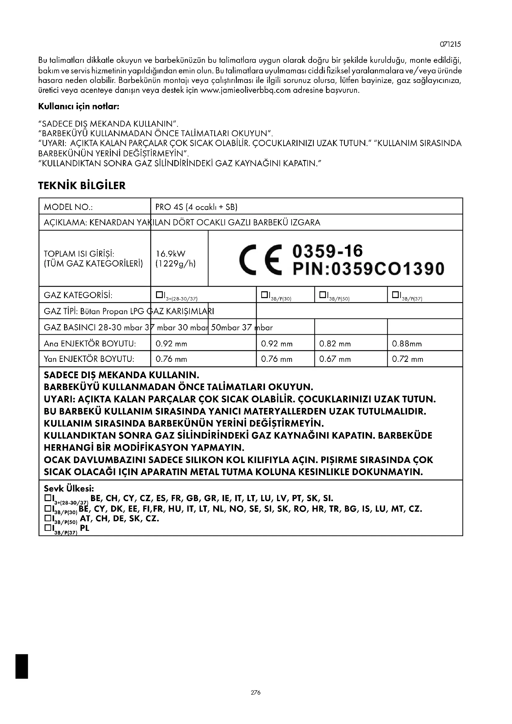 Bu talimatları dikkatle okuyun ve barbekünüzün bu talimatlara uygun olarak doğru bir şekilde kurulduğu, monte edildiği, bakım ve servis hizmetinin yapıldığından emin olun. Bu talimatlara uyulmaması ciddi fiziksel yaralanmalara ve/veya üründe hasara neden olabilir. Barbekünün montajı veya çalıştırılması ile ilgili sorunuz olursa, lütfen bayinize, gaz sağlayıcınıza, üretici veya acenteye danışın veya destek için www.jamieoliverbbq.com adresine başvurun. Kullanıcı için notlar: “SADECE DIŞ MEKANDA KULLANIN”. “BARBEKÜYÜ KULLANMADAN ÖNCE TALİMATLARI OKUYUN”. “UYARI: AÇIKTA KALAN PARÇALAR ÇOK SICAK OLABİLİR. ÇOCUKLARINIZI UZAK TUTUN.” “KULLANIM SIRASINDA BARBEKÜNÜN YERİNİ DEĞİŞTİRMEYİN”. “KULLANDIKTAN SONRA GAZ SİLİNDİRİNDEKİ GAZ KAYNAĞINI KAPATIN.”