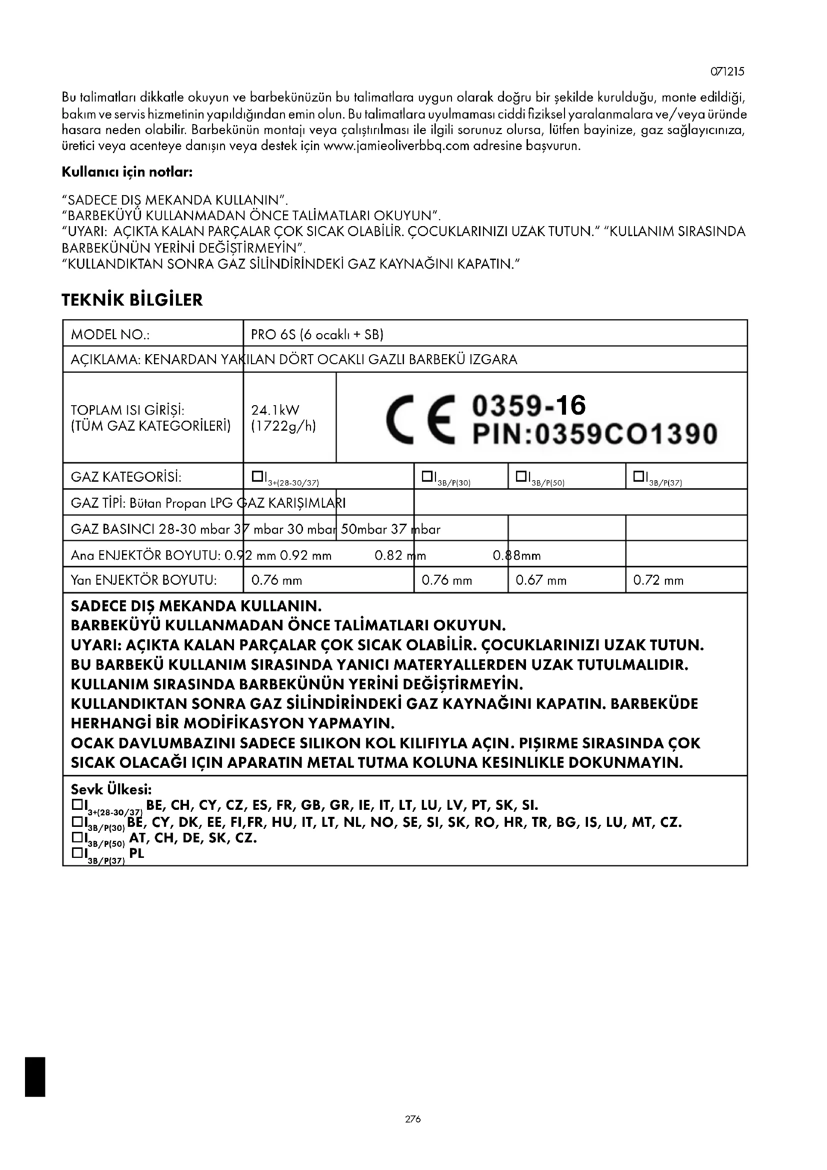 Bu talimatları dikkatle okuyun ve barbekünüzün bu talimatlara uygun olarak doğru bir şekilde kurulduğu, monte edildiği, bakım ve servis hizmetinin yapıldığından emin olun. Bu talimatlar a uyulmaması ciddi fiziksel yaralanmalara ve/veya üründe hasara neden olabilir. Barbekünün montajı veya çalıştırılması ile ilgili sorunuz olursa, lütfen bayinize, gaz sağlayıcınıza, üretici veya acenteye danışın veya destek için www.jamieoliverbbq.com adresine başvurun. Kullanıcı için notlar: “SADECE DIŞ MEKANDA KULLANIN”. “BARBEKÜYÜ KULLANMADAN ÖNCE TALİMATLARI OKUYUN”. “UYARI: AÇIKTA KALAN PARÇALAR ÇOK SICAK OLABİLİR. ÇOCUKLARINIZI UZAK TUTUN.” “KULLANIM SIRASINDA BARBEKÜNÜN YERİNİ DEĞİŞT