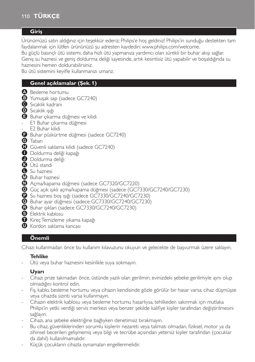Besleme hortumu Yumuşak sap (sadece GC7240) Sıcaklık kadranı Sıcaklık ışığı Buhar çıkarma düğmesi ve kilidi E1 Buhar çıkarma düğmesi E2 Buhar kilidi Buhar püskürtme düğmesi (sadece GC7240) Taban Güvenli saklama kilidi (sadece GC7240) Doldurma deliği kapağı Doldurma deliği Ütü standı Su haznesi Buhar haznesi Açma/kapama düğmesi (sadece GC7320/GC7220) Güç açık ışıklı açma/kapama düğmesi (sadece (GC7330/GC7240/GC7230) Su haznesi boş ışığı (sadece GC7330/GC7240/GC7230) Buhar ayar düğmesi (sadece GC7330/GC7240/GC7230) Buhar ışıkları (sadece GC7330/GC7240/GC7230) Elektrik kablosu Kireç Temizleme yıkama kapağı Kordon saklama kancası Önemli Cihazı kullanmadan önce bu kullanım kılavuzunu okuyun ve gelecekte de başvurmak üzere saklayın.