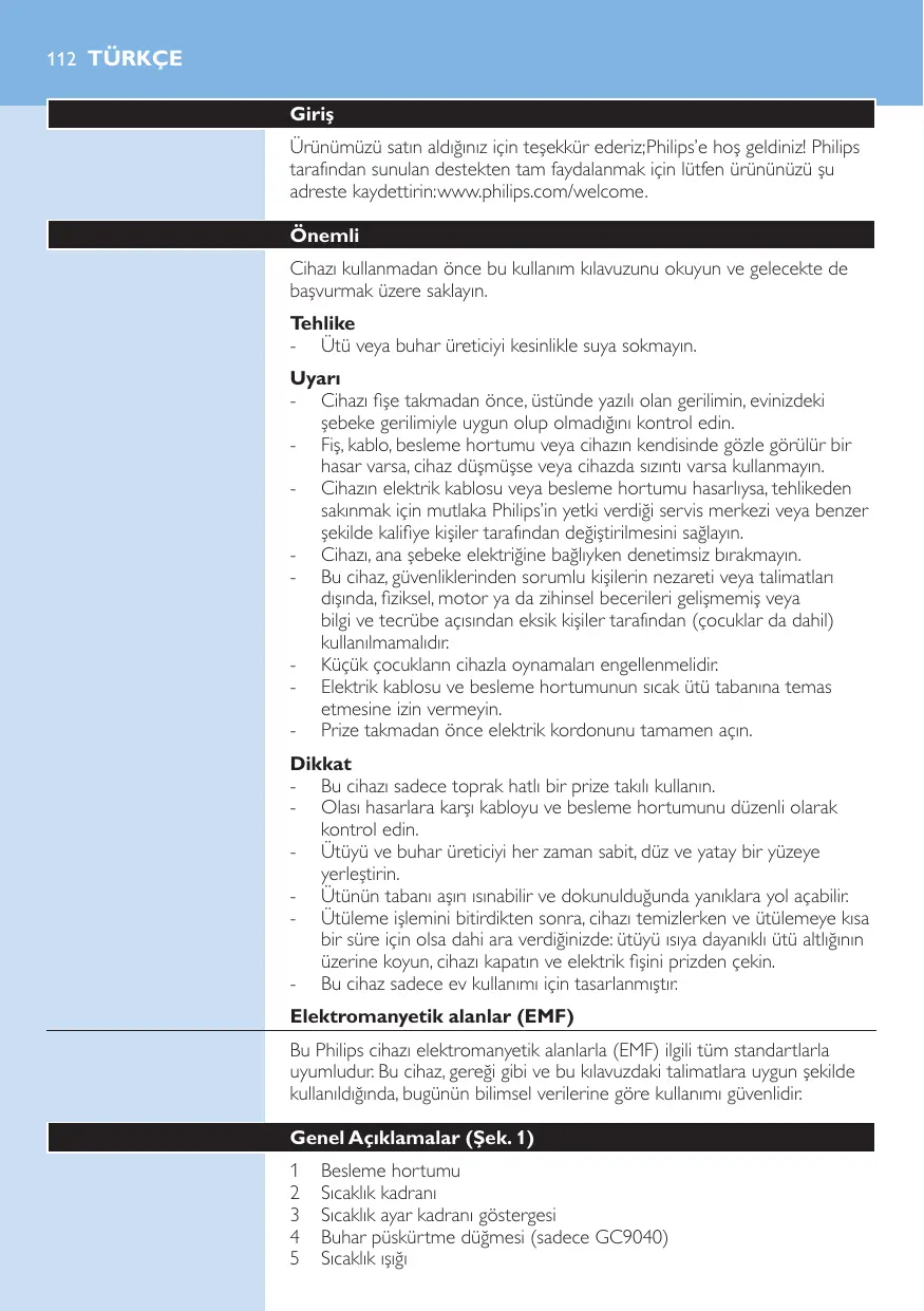 Kasta inte apparaten i hushållssoporna när den är förbrukad. Lämna in den för återvinning vid en officiell återvinningsstation, så hjälper du till att skydda miljön. Garanti och service Om du behöver information eller har problem med apparaten kan du besöka Philips webbplats på www.philips.com eller kontakta Philips kundtjänst i ditt land (du hittar telefonnumret i garantibroschyren). Om det inte finns någon kundtjänst i ditt land vänder du dig till din lokala Philipsåterförsäljare. 112 Türkçe Giriş Ürünümüzü satın aldığınız için teşekkür ederiz; Philips’e hoş geldiniz! Philips tarafından sunulan destekten tam faydalanmak için lütfen ürününüzü şu adreste kaydettirin: www.philips.com/welcome. Önemli Cihazı kullanmadan önce bu kullanım kılavuzunu okuyun ve gelecekte de başvurmak üzere saklayın. Tehlike - Ütü veya buhar üreticiyi kesinlikle suya sokmayın. Uyarı - Cihazı fişe takmadan önce, üstünde yazılı olan gerilimin, evinizdeki şebeke gerilimiyle uygun olup olmadığını kontrol edin. - Fiş, kablo, besleme hortumu veya cihazın kendisinde gözle görülür bir hasar varsa, cihaz düşmüşse veya cihazda sızıntı varsa kullanmayın. - Cihazın elektrik kablosu veya besleme hortumu hasarlıysa, tehlikeden sakınmak için mutlaka Philips’in yetki verdiği servis merkezi veya benzer şekilde kalifiye kişiler tarafından değiştirilmesini sağlayın. - Cihazı, ana şebeke elektriğine bağlıyken denetimsiz bırakmayın. - Bu cihaz, güvenliklerinden sorumlu kişilerin nezareti veya talimatları dışında, fiziksel, motor ya da zihinsel becerileri gelişmemiş veya bilgi ve tecrübe açısından eksik kişiler tarafından (çocuklar da dahil) kullanılmamalıdır. - Küçük çocukların cihazla oynamaları engellenmelidir. - Elektrik kablosu ve besleme hortumunun sıcak ütü tabanına temas etmesine izin vermeyin. - Prize takmadan önce elektrik kordonunu tamamen açın. Dikkat - Bu cihazı sadece toprak hatlı bir prize takılı kullanın. - Olası hasarlara karşı kabloyu ve besleme hortumunu düzenli olarak kontrol edin. - Ütüyü ve buhar üreticiyi her zaman sabit, düz ve yatay bir yüzeye yerleştirin. - Ütünün tabanı aşırı ısınabilir ve dokunulduğunda yanıklara yol açabilir. - Ütüleme işlemini bitirdikten sonra, cihazı temizlerken ve ütülemeye kısa bir süre için olsa dahi ara verdiğinizde: ütüyü ısıya dayanıklı ütü altlığının üzerine koyun, cihazı kapatın ve elektrik fişini prizden çekin. - Bu cihaz sadece ev kullanımı için tasarlanmıştır. Elektromanyetik alanlar (EMF) Bu Philips cihazı elektromanyetik alanlarla (EMF) ilgili tüm standartlarla uyumludur. Bu cihaz, gereği gibi ve bu kılavuzdaki talimatlara uygun şekilde kullanıldığında, bugünün bilimsel verilerine göre kullanımı güvenlidir. Genel Açıklamalar (Şek. 1)