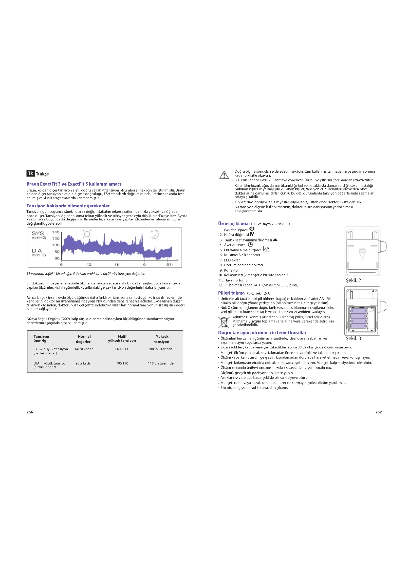 Türkçe Braun ExactFit 3 ve ExactFit 5 kullanım amacı Braun, koldan ölçer tansiyon aleti, doğru ve rahat tansiyon ölçümleri almak için geliştirilmiştir. Braun koldan ölçer tansiyon aletinin ölçme doğruluğu, ESH standardı doğrultusunda üretim sırasında test edilmiş ve klinik araştırmalarda kanıtlanmıştır. Tansiyon hakkında bilmeniz gerekenler Tansiyon, gün boyunca sürekli olarak değişir. Sabahın erken saatlerinde hızla yükselir ve öğleden önce düşer. Tansiyon, öğleden sonra tekrar yükselir ve nihayet geceleyin düşük bir düzeye iner. Ayrıca kısa bir süre boyunca da değişebilir. Bu nedenle, arka arkaya yapılan ölçümlerden alınan sonuçlar değişkenlik gösterebilir. 31 yaşında, sağlıklı bir erkeğin 5 dakika aralıklarla ölçülmüş tansiyon değerleri Bir doktorun muayenehanesinde ölçülen tansiyon sadece anlık bir değer sağlar. Evde tekrar tekrar yapılan ölçümler, kişinin gündelik koşullardaki gerçek tansiyon değerlerini daha iyi yansıtır. Ayrıca birçok insan, evde ölçüldüğünde daha farklı bir tansiyona sahiptir, çünkü insanlar evlerinde kendilerini doktor muayenehanesindeyken olduğundan daha rahat hissederler. Evde alınan düzenli tansiyon ölçümleri, doktorunuza gerçek “gündelik” koşullardaki normal tansiyonunuza ilişkin değerli bilgiler sağlayabilir. Dünya Sağlık Örgütü (DSÖ), kalp atışı dinlenme halindeyken ölçüldüğünde standart tansiyon değerlerini aşağıdaki gibi belirlemiştir. Tansiyon (mmHg) Normal değerler Hafif yüksek tansiyon Yüksek tansiyon SYS = büyük tansiyon 140’a kadar 140-180 180’in üzerinde (üstteki değer) DIA = küçük tansiyon 90’a kadar 90-110 110’un üzerinde (alttaki değer)