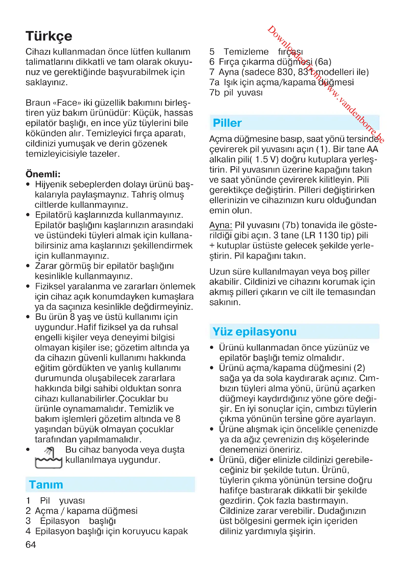 Bu cihaz banyoda veya duşta kullanılmaya uygundur. Tanım 1 Pil yuvası 2 Açma / kapama düğmesi 3 Epilasyon başlığı 4 Epilasyon başlığı için koruyucu kapak 5 Temizleme fırçası 6 Fırça çıkarma düğmesi (6a) 7 Ayna (sadece 830, 831 modelleri ile) 7a Işık için açma/kapama düğmesi 7b pil yuvası Piller Açma düğmesine basıp, saat yönü tersinde çevirerek pil yuvasını açın (1). Bir tane AA alkalin pili( 1.5 V) doğru kutuplara yerleş- tirin. Pil yuvasının üzerine kapağını takın ve saat yönünde çevirerek kilitleyin. Pili gerektikçe değiştirin. Pilleri değiştirirken ellerinizin ve cihazınızın kuru olduğundan emin olun. Ayna: Pil yuvasını (7b) tonavida ile göste- rildiği gibi açın. 3 tane (LR 1130 tip) pili + kutuplar üstüste gelecek şekilde yerle- ştirin. Pil kapağını takın. Uzun süre kullanılmayan veya boş piller akabilir. Cildinizi ve cihazını korumak için akmış pilleri çıkarın ve cilt ile temasından sakının. Yüz epilasyonu