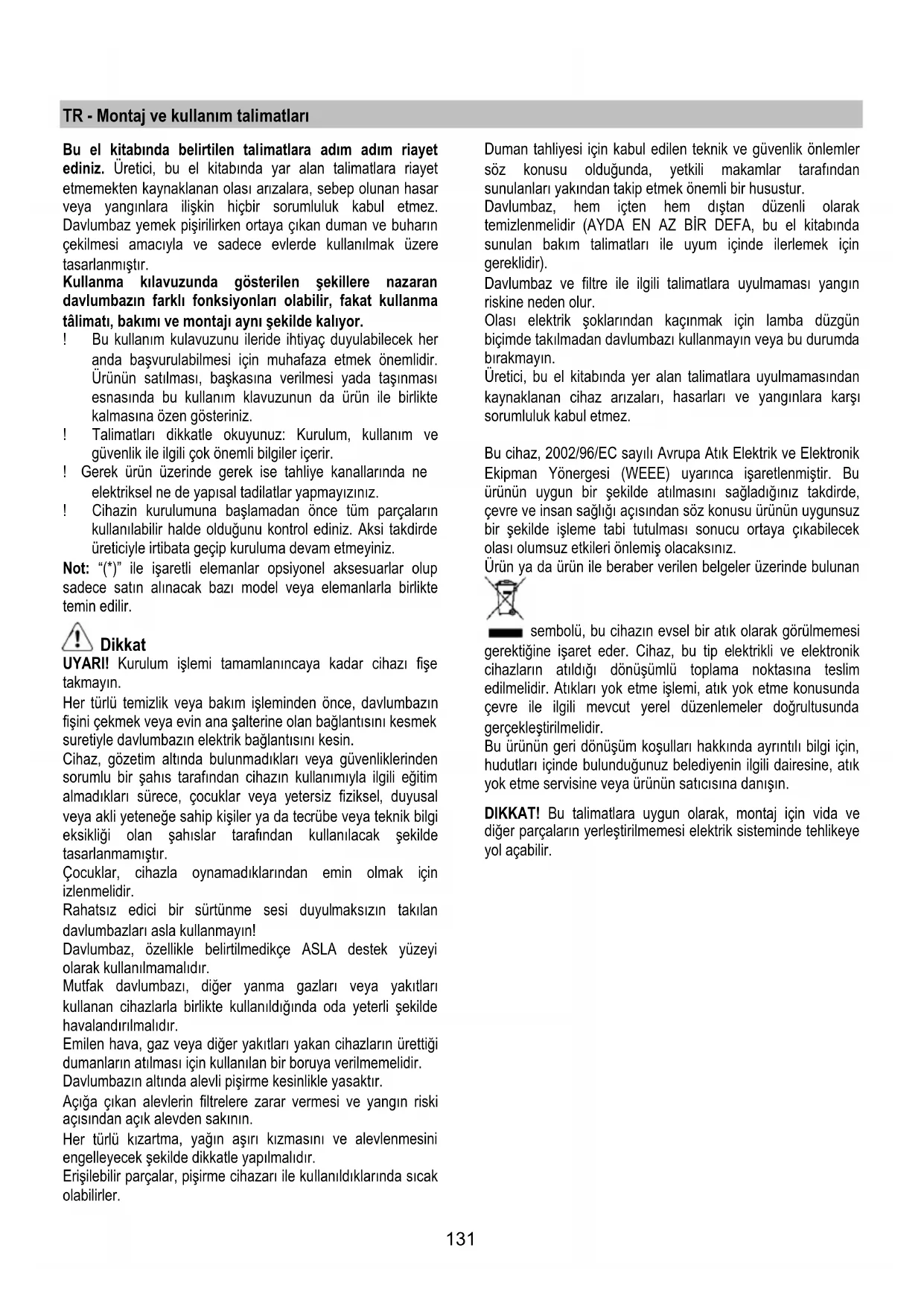 - Aktivni karbonski filtar koji se NE može oprati. Aktivni karbonski filtar koji se može oprati Karbonski filtar trebate oprati svaka dva mjeseca u toploj vodi s prikladnim deterdžentima ili u perilici za posuđe na 65°C ( u slučaju pranja u perilici za posuđe odaberite kompletan ciklus pranja bez da perete i drugo posuđe zajedno s karbonskim filtrom ). Uklonite višak vode nakon pranja bez da oštetite filtar, nakon čega ćete izvaditi i madraščić koji se nalazi unutar plastičnog ležišta,te ćete ga položiti u pećnicu oko 10 minuta na 100°C kako bi ga definitivo osušili. Zamijenite madraščić svake 3 godine ili svaki put kada vidite da je on oštećen. Aktivni karbonski filtar koji se NE može oprati. Zasićenje karbonskog filtra se pojavljuje poslije manje-više produljene uporabe s obzirom na tip kuhinje i na urednost u čišćenju filtera za uklanjanje masnoće. U svakom slučaju je potrebno zamijeniti kartušu barem svaka četiri mjeseca. NE može se niti oprati, niti obnoviti. Montaža Zakačite aktivni karbonski filter najprije sa stražnje strane na metalni preklopac kuhinjske nape, potom na prednjoj strani uz pomoć dvije okrugle drške. Razmontiranje Uklonite aktivni karbonski filter okrećući 90° okrugle drške koje ga pričvršćuju za kuhinjsku napu. Zamjena Lampe Kuhinjska napa je opremljena sustavom rasvjete koji se bazira na tehnologiji INDIKACIONIH SVJETALA. INDIKACIONA SVJETLA garantiraju optimalnu rasvjetu te trajnost 10 puta veću od tradicionalnih lampi a omogućuju i uštedu od 90% električne energije. U svezi sa zamjenom, obratite se tehničkoj potpori.131 TR - Montaj ve kullanım talimatları Bu el kitabında belirtilen talimatlara adım adım riayet ediniz. Üretici, bu el kitabında yar alan talimatlara riayet etmemekten kaynaklanan olası arızalara, sebep olunan hasar veya yangınlara ilişkin hiçbir sorumluluk kabul etmez. Davlumbaz yemek pişirilirken ortaya çıkan duman ve buharın çekilmesi amacıyla ve sadece evlerde kullanılmak üzere tasarlanmıştır. Kullanma kılavuzunda gösterilen şekillere nazaran davlumbazın farklı fonksiyonları olabilir, fakat kullanma tâlimatı, bakımı ve montajı aynı şekilde kalıyor. ! Bu kullanım kulavuzunu ileride ihtiyaç duyulabilecek her anda başvurulabilmesi için muhafaza etmek önemlidir. Ürünün satılması, başkasına verilmesi yada taşınması esnasında bu kullanım klavuzunun da ürün ile birlikte kalmasına özen gösteriniz. ! Talimatları dikkatle okuyunuz: Kurulum, kullanım ve güvenlik ile ilgili çok önemli bilgiler içerir. ! Gerek ürün üzerinde gerek ise tahliye kanallarında ne elektriksel ne de yapısal tadilatlar yapmayızınız. ! Cihazin kurulumuna başlamadan önce tüm parçaların kullanılabilir halde olduğunu kontrol ediniz. Aksi takdirde üreticiyle irtibata geçip kuruluma devam etmeyiniz. Not: “(*)” ile işaretli elemanlar opsiyonel aksesuarlar olup sadece satın alınacak bazı model veya elemanlarla birlikte temin edilir. Dikkat UYARI! Kurulum işlemi tamamlanıncaya kadar cihazı fişe takmayın. Her türlü temizlik veya bakım işleminden önce, davlumbazın fişini çekmek veya evin ana şalterine olan bağlantısını kesmek suretiyle davlumbazın elektrik bağlantısını kesin. Cihaz, gözetim altında bulunmadıkları veya güvenliklerinden sorumlu bir şahıs tarafından cihazın kullanımıyla ilgili eğitim almadıkları sürece, çocuklar veya yetersiz fiziksel, duyusal veya akli yeteneğe sahip kişiler ya da tecrübe veya teknik bilgi eksikliği olan şahıslar tarafından kullanılacak şekilde tasarlanmamıştır. Çocuklar, cihazla oynamadıklarından emin olmak için izlenmelidir. Rahatsız edici bir sürtünme sesi duyulmaksızın takılan davlumbazları asla kullanmayın! Davlumbaz, özellikle belirtilmedikçe ASLA destek yüzeyi olarak kullanılmamalıdır. Mutfak davlumbazı, diğer yanma gazları veya yakıtları kullanan cihazlarla birlikte kullanıldığında oda yeterli şekilde havalandırılmalıdır. Emilen hava, gaz veya diğer yakıtları yakan cihazların ürettiği dumanların atılması için kullanılan bir boruya verilmemelidir. Davlumbazın altında alevli pişirme kesinlikle yasaktır. Açığa çıkan alevlerin filtrelere zarar vermesi ve yangın riski açısından açık alevden sakının. Her türlü kı zartma, yağın aşırı kızmasını ve alevlenmesini engelleyecek şekilde dikkatle yapılmalıdır. Erişilebilir parçalar, pişirme cihazarı ile kullanıldıklarında sıcak olabilirler. Duman tahliyesi için kabul edilen teknik ve güvenlik önlemler söz konusu olduğunda, yetkili makamlar tarafından sunulanları yakından takip etmek önemli bir husustur. Davlumbaz, hem içten hem dıştan düzenli olarak temizlenmelidir (AYDA EN AZ BİR DEFA, bu el kitabında sunulan bakım talimatları ile uyum içinde ilerlemek için gereklidir). Davlumbaz ve filtre ile ilgili talimatlara uyulmaması yangın riskine neden olur. Olası elektrik şoklarından kaçınmak için lamba düzgün biçimde takılmadan davlumbazı kullanmayın veya bu durumda bırakmayın. Üretici, bu el kitabında yer alan talimatlara uyulmamasından kaynaklanan cihaz arızaları , hasarları ve yangınlara karşı sorumluluk kabul etmez. Bu cihaz, 2002/96/EC sayılı Avrupa Atık Elektrik ve Elektronik Ekipman Yönergesi (WEEE) uyarınca işaretlenmiştir. Bu ürünün uygun bir şekilde atılmasını sağladığınız takdirde, çevre ve insan sağlığı açısından söz konusu ürünün uygunsuz bir şekilde işleme tabi tutulması sonucu ortaya çıkabilecek olası olumsuz etkileri önlemiş olacaksınız. Ürün ya da ürün ile beraber verilen belgeler üzerinde bulunan sembolü, bu cihazın evsel bir atık olarak görülmemesi gerektiğine işaret eder. Cihaz, bu tip elektrikli ve elektronik cihazların atıldığı dönüşümlü toplama noktasına teslim edilmelidir. Atıkları yok etme işlemi, atık yok etme konu