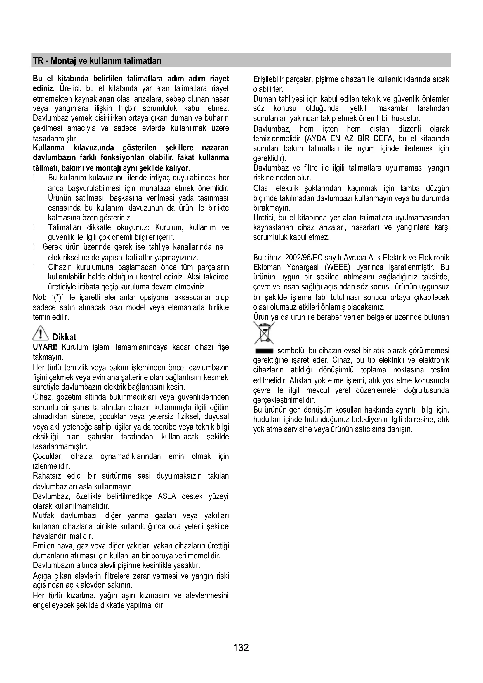 - Aktivni karbonski filtar koji se NE može oprati. Aktivni karbonski filtar koji se može oprati Karbonski filtar trebate oprati svaka dva mjeseca u toploj vodi s prikladnim deterdžentima ili u perilici za posuđe na 65°C ( u slučaju pranja u perilici za posuđe odaberite kompletan ciklus pranja bez da perete i drugo posuđe zajedno s karbonskim filtrom ). Uklonite višak vode nakon pranja bez da oštetite filtar, nakon čega ćete izvaditi i madraščić koji se nalazi unutar plastičnog ležišta,te ćete ga položiti u pećnicu oko 10 minuta na 100°C kako bi ga definitivo osušili. Zamijenite madraščić svake 3 godine ili svaki put kada vidite da je on oštećen. Aktivni karbonski filtar koji se NE može oprati. Zasićenje karbonskog filtra se pojavljuje poslije manje-više produljene uporabe s obzirom na tip kuhinje i na urednost u čišćenju filtera za uklanjanje masnoće. U svakom slučaju je potrebno zamijeniti kartušu barem svaka četiri mjeseca. NE može se niti oprati, niti obnoviti. Montaža Zakačite aktivni karbonski filter najprije sa stražnje strane na metalni preklopac kuhinjske nape, potom na prednjoj strani uz pomoć dvije okrugle drške. Razmontiranje Uklonite aktivni karbonski filter okrećući 90° okrugle drške koje ga pričvršćuju za kuhinjsku napu. Zamjena Lampe Kuhinjska napa je opremljena sustavom rasvjete koji se bazira na tehnologiji INDIKACIONIH SVJETALA. INDIKACIONA SVJETLA garantiraju optimalnu rasvjetu te trajnost 10 puta veću od tradicionalnih lampi a omogućuju i uštedu od 90% električne energije. U svezi sa zamjenom, obratite se tehničkoj potpori.132 TR - Montaj ve kullanım talimatları Bu el kitabında belirtilen talimatlara adım adım riayet ediniz. Üretici, bu el kitabında yar alan talimatlara riayet etmemekten kaynaklanan olası arızalara, sebep olunan hasar veya yangınlara ilişkin hiçbir sorumluluk kabul etmez. Davlumbaz yemek pişirilirken ortaya çıkan duman ve buharın çekilmesi amacıyla ve sadece evlerde kullanılmak üzere tasarlanmıştır. Kullanma kılavuzunda gösterilen şekillere nazaran davlumbazın farklı fonksiyonları olabilir, fakat kullanma tâlimatı, bakımı ve montajı aynı şekilde kalıyor. ! Bu kullanım kulavuzunu ileride ihtiyaç duyulabilecek her anda başvurulabilmesi için muhafaza etmek önemlidir. Ürünün satılması, başkasına verilmesi yada taşınması esnasında bu kullanım klavuzunun da ürün ile birlikte kalmasına özen gösteriniz. ! Talimatları dikkatle okuyunuz: Kurulum, kullanım ve güvenlik ile ilgili çok önemli bilgiler içerir. ! Gerek ürün üzerinde gerek ise tahliye kanallarında ne elektriksel ne de yapısal tadilatlar yapmayızınız. ! Cihazin kurulumuna başlamadan önce tüm parçaların kullanılabilir halde olduğunu kontrol ediniz. Aksi takdirde üreticiyle irtibata geçip kuruluma devam etmeyiniz. Not: “(*)” ile işaretli elemanlar opsiyonel aksesuarlar olup sadece satın alınacak bazı model veya elemanlarla birlikte temin edilir. Dikkat UYARI! Kurulum işlemi tamamlanıncaya kadar cihazı fişe takmayın. Her türlü temizlik veya bakım işleminden önce, davlumbazın fişini çekmek veya evin ana şalterine olan bağlantısını kesmek suretiyle davlumbazın elektrik bağlantısını kesin. Cihaz, gözetim altında bulunmadıkları veya güvenliklerinden sorumlu bir şahıs tarafından cihazın kullanımıyla ilgili eğitim almadıkları sürece, çocuklar veya yetersiz fiziksel, duyusal veya akli yeteneğe sahip kişiler ya da tecrübe veya teknik bilgi eksikliği olan şahıslar tarafından kullanılacak şekilde tasarlanmamıştır. Çocuklar, cihazla oynamadıklarından emin olmak için izlenmelidir. Rahatsız edici bir sürtünme sesi duyulmaksızın takılan davlumbazları asla kullanmayın! Davlumbaz, özellikle belirtilmedikçe ASLA destek yüzeyi olarak kullanılmamalıdır. Mutfak davlumbazı, diğer yanma gazları veya yakıtları kullanan cihazlarla birlikte kullanıldığında oda yeterli şekilde havalandırılmalıdır. Emilen hava, gaz veya diğer yakıtları yakan cihazların ürettiği dumanların atılması için kullanılan bir boruya verilmemelidir. Davlumbazın altında alevli pişirme kesinlikle yasaktır. Açığa çıkan alevlerin filtrelere zarar vermesi ve yangın riski açısından açık alevden sakının. Her türlü kı zartma, yağın aşırı kızmasını ve alevlenmesini engelleyecek şekilde dikkatle yapılmalıdır. Erişilebilir parçalar, pişirme cihazarı ile kullanıldıklarında sıcak olabilirler. Duman tahliyesi için kabul edilen teknik ve güvenlik önlemler söz konusu olduğunda, yetkili makamlar tarafından sunulanları yakından takip etmek önemli bir husustur. Davlumbaz, hem içten hem dıştan düzenli olarak temizlenmelidir (AYDA EN AZ BİR DEFA, bu el kitabında sunulan bakım talimatları ile uyum içinde ilerlemek için gereklidir). Davlumbaz ve filtre ile ilgili talimatlara uyulmaması yangın riskine neden olur. Olası elektrik şoklarından kaçınmak için lamba düzgün biçimde takılmadan davlumbazı kullanmayın veya bu durumda bırakmayın. Üretici, bu el kitabında yer alan talimatlara uyulmamasından kaynaklanan cihaz arızaları, hasarlar ı ve yangınlara karşı sorumluluk kabul etmez. Bu cihaz, 2002/96/EC sayılı Avrupa Atık Elektrik ve Elektronik Ekipman Yönergesi (WEEE) uyarınca işaretlenmiştir. Bu ürünün uygun bir şekilde atılmasını sağladığınız takdirde, çevre ve insan sağlığı açısından söz konusu ürünün uygunsuz bir şekilde işleme tabi tutulması sonucu ortaya çıkabilecek olası olumsuz etkileri önlemiş olacaksınız. Ürün ya da ürün ile beraber verilen belgeler üzerinde bulunan sembolü, bu cihazın evsel bir atık olarak görülmemesi gerektiğine işaret eder. Cihaz, bu tip elektrikli ve elektronik cihazların atıldığı dönüşümlü toplama noktasına teslim edilmelidir. Atıkları yok etme işlemi, atık yok etme konu