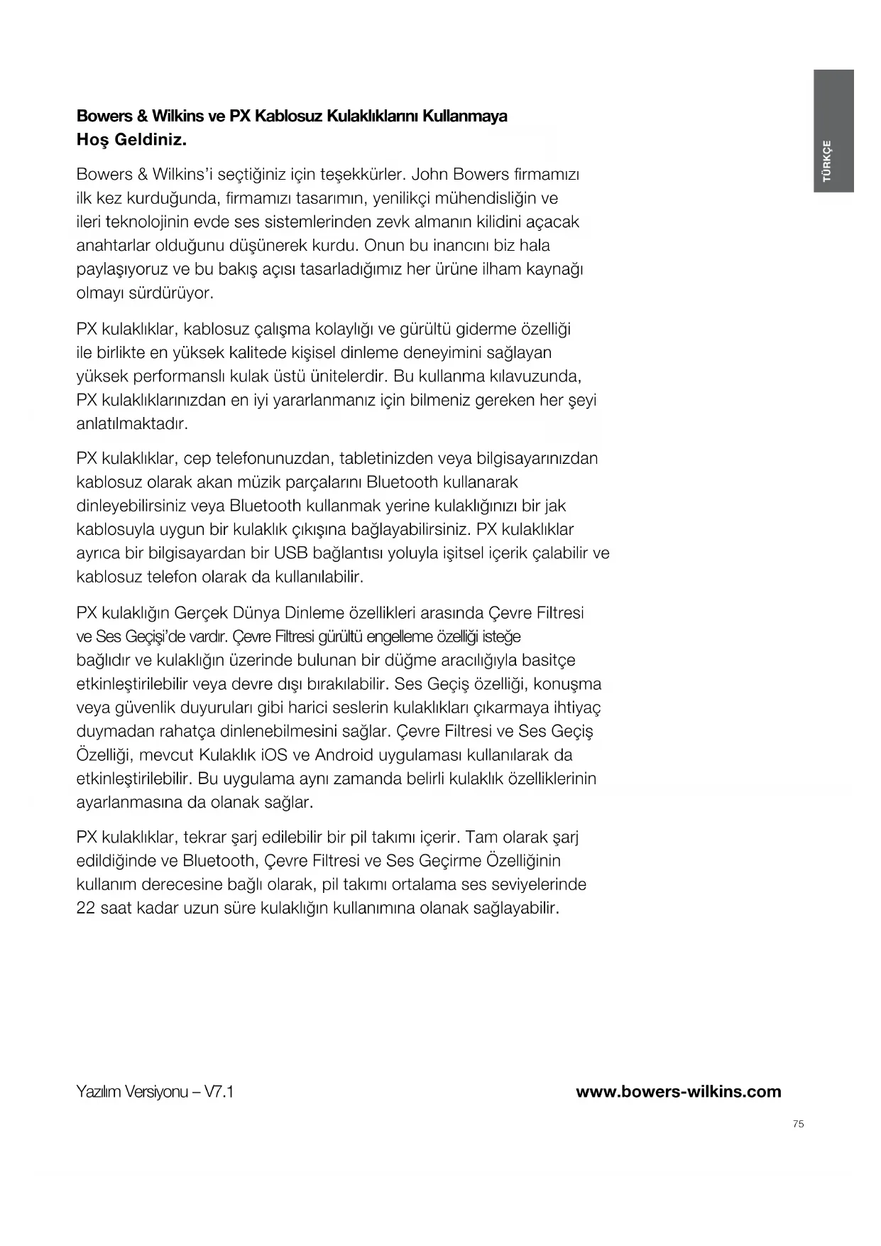 www.bowers-wilkins.com Bowers & Wilkins ve PX Kablosuz Kulaklıklarını Kullanmaya HoşGeldiniz. Bowers & Wilkins’i seçtiğiniz için teşekkürler. John Bowers rmamızı ilk kez kurduğunda, rmamızı tasarımın, yenilikçi mühendisliğin ve ileri teknolojinin evde ses sistemlerinden zevk almanın kilidini açacak anahtarlar olduğunu düşünerek kurdu. Onun bu inancını biz hala paylaşıyoruz ve bu bakış açısı tasarladığımız her ürüne ilham kaynağı olmayı sürdürüyor. PX kulaklıklar, kablosuz çalışma kolaylığı ve gürültü giderme özelliği ile birlikte en yüksek kalitede kişisel dinleme deneyimini sağlayan yüksek performanslı kulak üstü ünitelerdir. Bu kullanma kılavuzunda, PX kulaklıklarınızdan en iyi yararlanmanız için bilmeniz gereken her şeyi anlatılmaktadır. PX kulaklıklar, cep telefonunuzdan, tabletinizden veya bilgisayarınızdan kablosuz olarak akan müzik parçalarını Bluetooth kullanarak dinleyebilirsiniz veya Bluetooth kullanmak yerine kulaklığınızı bir jak kablosuyla uygun bir kulaklık çıkışına bağlayabilirsiniz. PX kulaklıklar ayrıca bir bilgisayardan bir USB bağlantısı yoluyla işitsel içerik çalabilir ve kablosuz telefon olarak da kullanılabilir. PX kulaklığın Gerçek Dünya Dinleme özellikleri arasında Çevre Filtresi ve Ses Geçişi’de vardır. Çevre Filtresi gürültü engelleme özelliği isteğe bağlıdır ve kulaklığın üzerinde bulunan bir düğme aracılığıyla basitçe etkinleştirilebilir veya devre dışı bırakılabilir. Ses Geçiş özelliği, konuşma veya güvenlik duyuruları gibi harici seslerin kulaklıkları çıkarmaya ihtiyaç duymadan rahatça dinlenebilmesini sağlar. Çevre Filtresi ve Ses Geçiş Özelliği, mevcut Kulaklık iOS ve Android uygulaması kullanılarak da etkinleştirilebilir. Bu uygulama aynı zamanda belirli kulaklık özelliklerinin ayarlanmasına da olanak sağlar. PX kulaklıklar, tekrar şarj edilebilir bir pil takımı içerir. Tam olarak şarj edildiğinde ve Bluetooth, Çevre Filtresi ve Ses Geçirme Özelliğinin kullanım derecesine bağlı olarak, pil takımı ortalama ses seviyelerinde 22saat kadar uzun süre kulaklığın kullanımına olanak sağlayabilir.