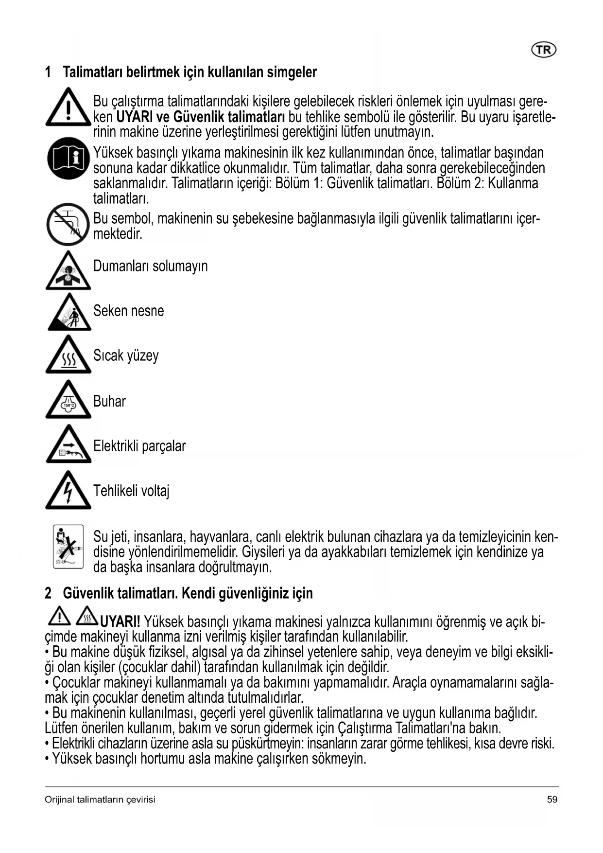- Εάν το καλώδιο ρεύματος έχει υποστεί ζημιά, πρέπει να αντικατασταθεί από τον κατασκευα- στή, τον αντιπρόσωπο σέρβις ή άλλο εξίσου εξειδικευμένο άτομο, για την αποφυγή κινδύνων.Orjnal talmatların çevrs 59 1 Talmatları belrtmek çn kullanılan smgeler Bu çalıştırma talmatlarındak kşlere geleblecek rskler önlemek çn uyulması gere- ken UYARI ve Güvenlk talmatları bu tehlke sembolü le gösterlr. Bu uyaru şaretle- rnn makne üzerne yerleştrlmes gerektğn lütfen unutmayın. Yüksek basınçlı yıkama maknesnn lk kez kullanımından önce, tal matlar başından sonuna kadar dkkatlce okunmalıdır. Tüm talmatlar, daha sonra gerekebleceğnden saklanmalıdır. Talmatların çerğ: Bölüm 1: Güvenlk talmatları. Bölüm 2: Kullanma talmatları. Bu sembol, maknenn su şebekesne bağlanmasıyla lgl güvenlk talmatlarını çer- mektedr. Dumanları solumayın Seken nesne Sıcak yüzey Buhar Elektrkl parçalar Tehlkel voltaj Su jet, nsanlara, hayvanlara, canlı elektr k bulunan chazlara ya da temzleycnn ken- dsne yönlendrlmemeldr. Gysler ya da ayakkabıları temzlemek çn kendnze ya da başka nsanlara doğrultmayın. 2 Güvenlk talmatları. Kend güvenlğnz çn UYARI! Yüksek basınçlı yıkama maknes yalnızca kullanımını öğrenmş ve açık b- çmde makney kullanma zn verlmş kşler tarafından kullanılablr.