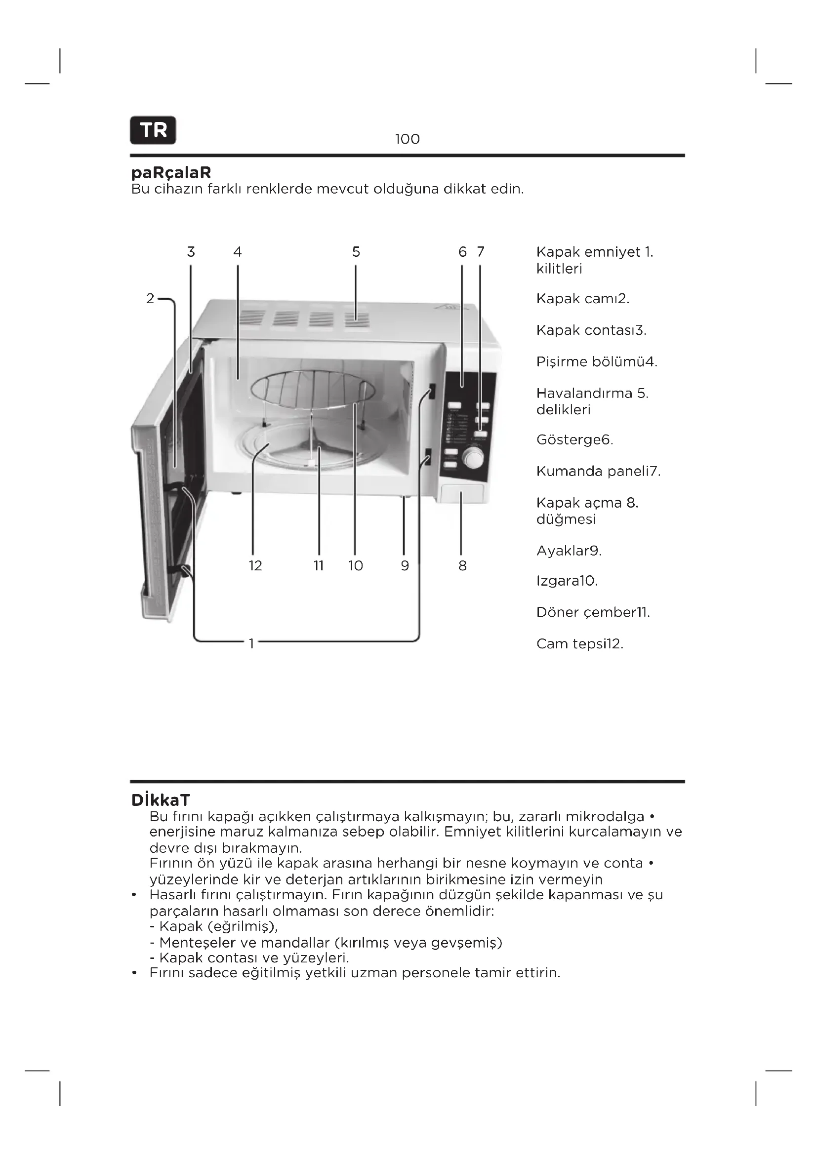 Kapak emniyet 1. kilitleri Kapak camı2. Kapak contası3. Pişirme bölümü4. Havalandırma 5. delikleri Gösterge6. Kumanda paneli7. Kapak açma 8. düğmesi Ayaklar9. Izgara10. Döner çember11. Cam tepsi12. DİkkaT paRçalaR