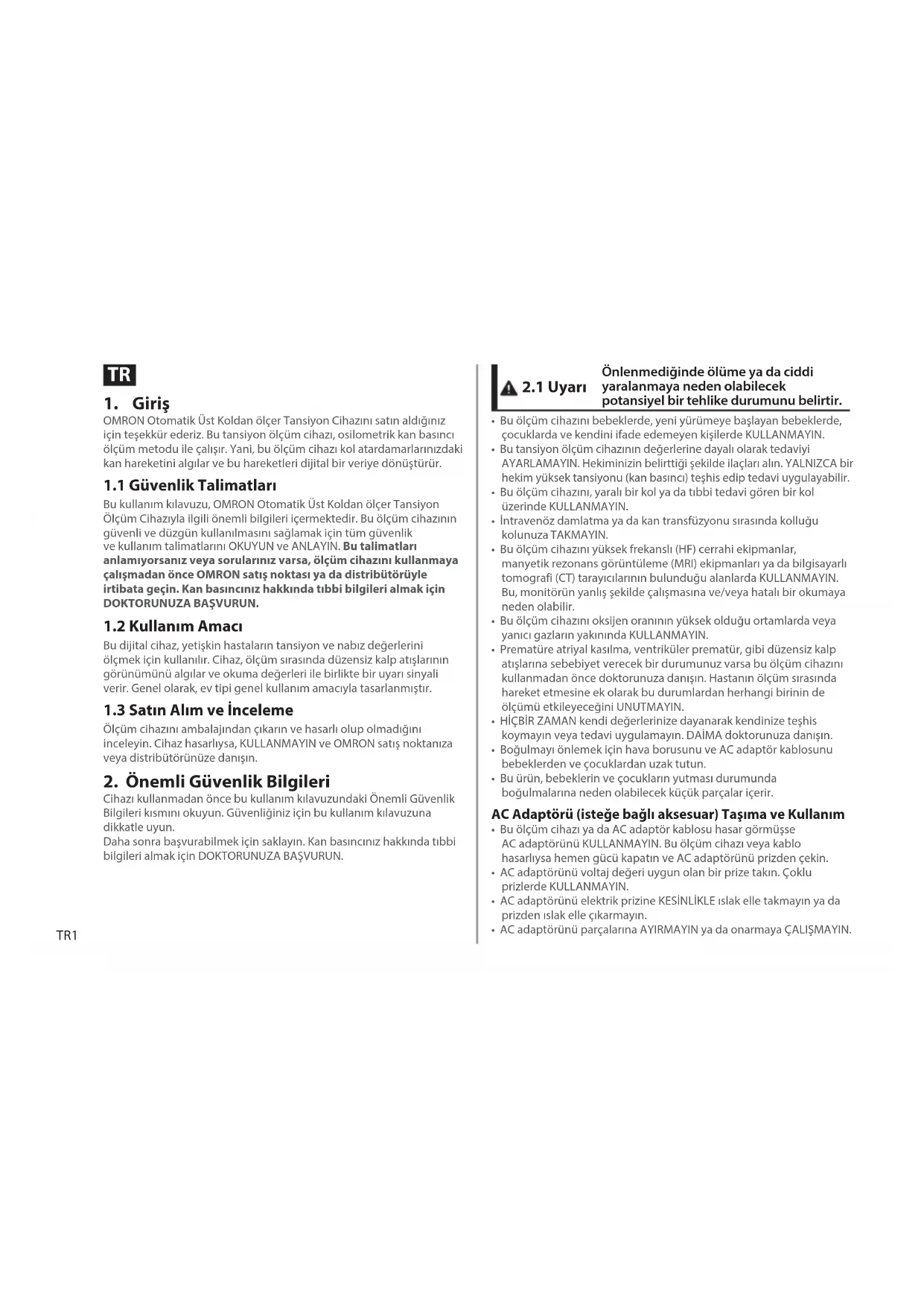Bu kullanım kılavuzu, OMRON Otomatik Üst Koldan ölçer Tansiyon Ölçüm Cihazıyla ilgili önemli bilgileri içermektedir. Bu ölçüm cihazının güvenli ve düzgün kullanılmasını sağlamak için tüm güvenlik ve kullanım talimatlarını OKUYUN ve ANLAYIN. Bu talimatları anlamıyorsanız veya sorularınız varsa, ölçüm cihazını kullanmaya çalışmadan önce OMRON satış noktası ya da distribütörüyle irtibata geçin. Kan basıncınız hakkında tıbbi bilgileri almak için DOKTORUNUZA BAŞVURUN.