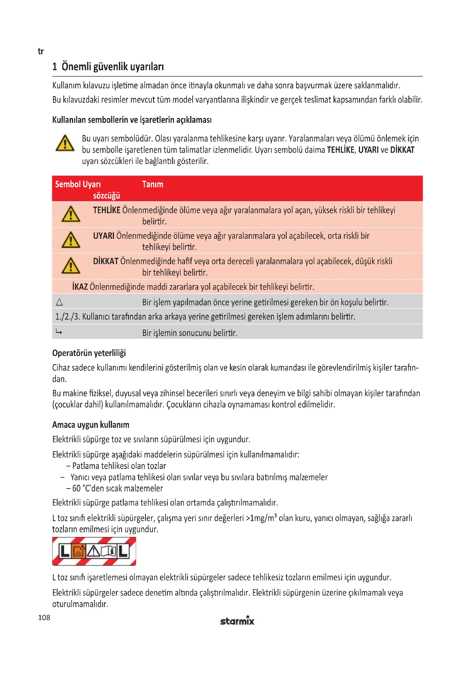 L toz sinif isaretlemesi olmayan elektrikli supurgeler sadece tehlikesiz tozlarin emilmesi icin uygundur.