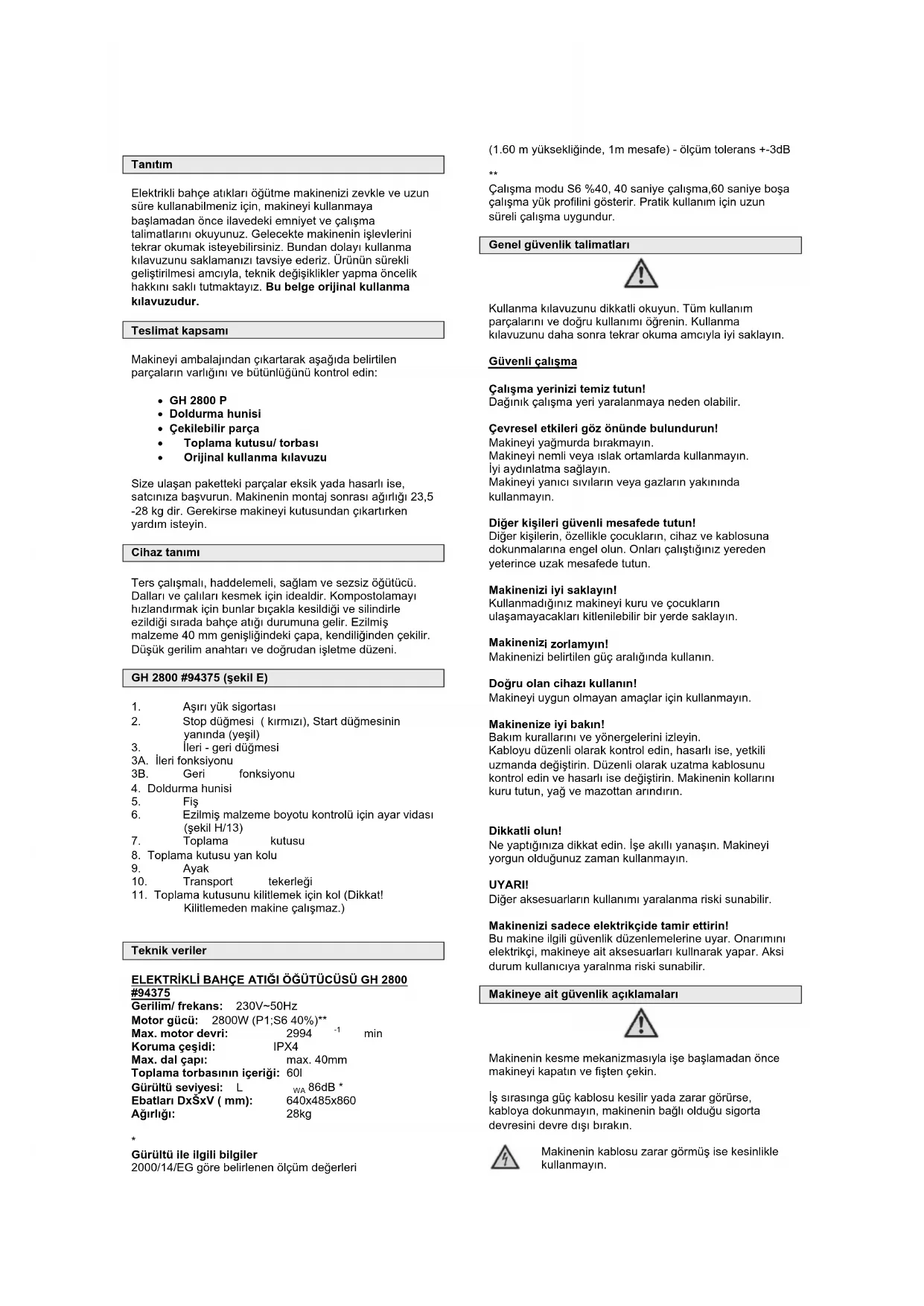 „Експлоатация“.Tanıtım Elektrikli bahçe atıkları öğütme makinenizi zevkle ve uzun süre kullanabilmeniz için, makineyi kullanmaya başlamadan önce ilavedeki emniyet ve çalışma talimatlarını okuyunuz. Gelecekte makinenin işlevlerini tekrar okumak isteyebilirsiniz. Bundan dolayı kullanma kılavuzunu saklamanızı tavsiye ederiz. Ürünün sürekli geliştirilmesi amcıyla, teknik değişiklikler yapma öncelik hakkını saklı tutmaktayız. Bu belge orijinal kullanma kılavuzudur. Teslimat kapsamı Makineyi ambalajından çıkartarak aşağıda belirtilen parçaların varlığını ve bütünlüğünü kontrol edin: GH 2800 P Doldurma hunisi Çekilebilir parça Toplama kutusu/ torbası Orijinal kullanma kılavuzu Size ulaşan paketteki parçalar eksik yada hasarlı ise, satcınıza başvurun. Makinenin montaj sonrası ağırlığı 23,5 -28 kg dir. Gerekirse makineyi kutusundan çıkartırken yardım isteyin. Cihaz tanımı Ters çalışmalı, haddelemeli, sağlam ve sezsiz öğütücü. Dalları ve çalıları kesmek için idealdir. Kompostolamayı hızlandırmak için bunlar bıçakla kesildiği ve silindirle ezildiği sırada bahçe atığı durumuna gelir. Ezilmiş malzeme 40 mm genişliğindeki çapa, kendiliğinden çekilir. Düşük gerilim anahtarı ve doğrudan işletme düzeni. GH 2800 #94375 (şekil E)