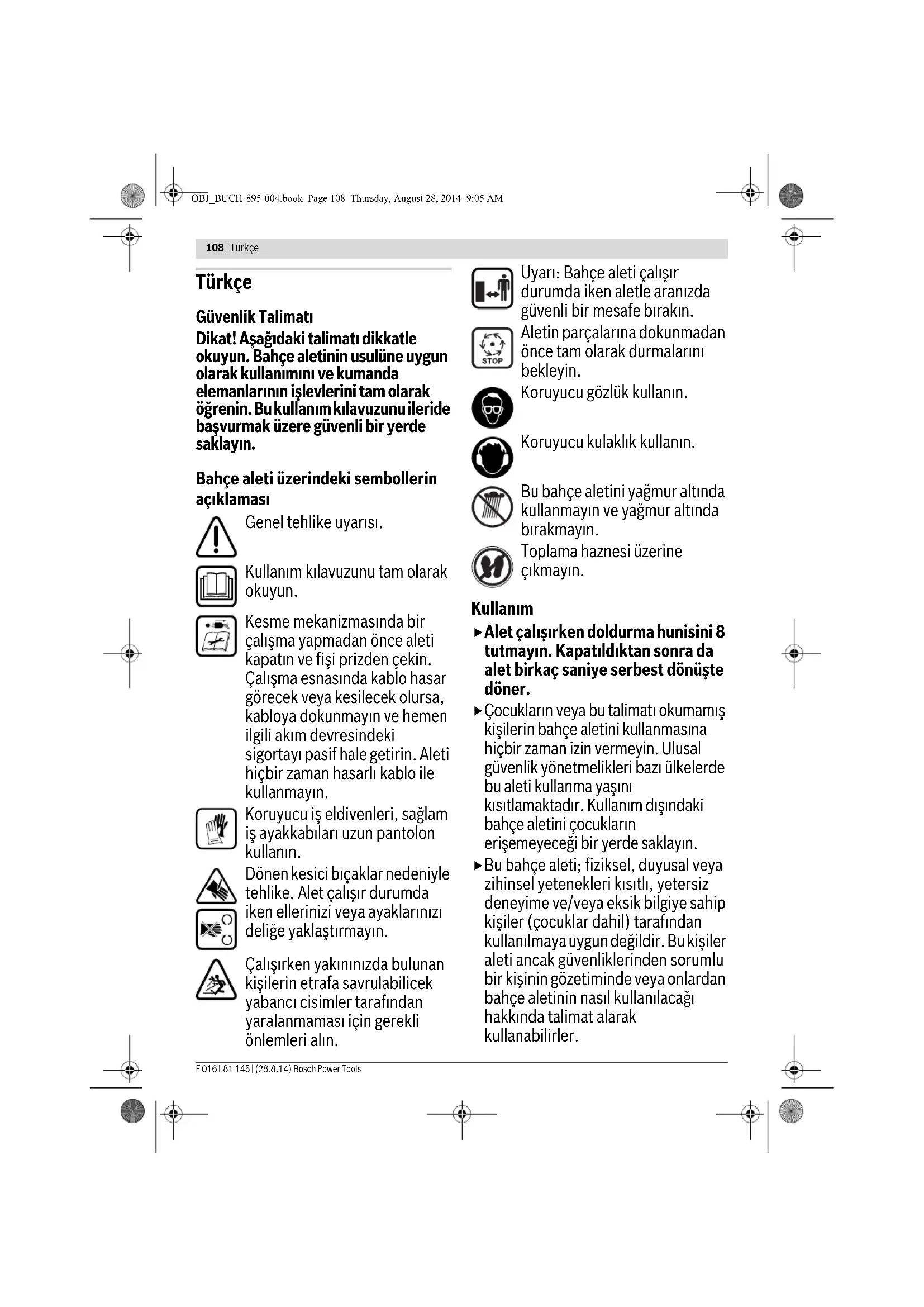 Μόνο για χώρες της ΕΕ: Σύμφωνα με την Κοινοτική Οδηγία 2012/19/EE σχετικά με τις παλαιές ηλεκτρικές και ηλεκτρονικές συσκευές και τη μεταφορά της οδηγίας αυτής σε εθνικό δίκαιο δεν είναι πλέον υποχρεωτικό τα άχρηστα ηλεκτρικά και ηλεκτρονικά μηχανήματα να συλλέγονται ξεχωριστά για να ανακυκλωθούν με τρόπο φιλικό προς το περιβάλλον. Τηρούμε το δικαίωμα αλλαγών. Ξεβιδώστε τελείως τη βίδα της πλάκας πίεσης όπως φαίνεται στην εικόνα. Αφαιρέστε την πλάκα πίεσης 15 ανασηκώνοντάς την με ένα κατσαβίδι. OBJ_BUCH-895-004.book Page 107 Thursday, August 28, 2014 9:05 AM108 | Türkçe F 016 L81 145 | (28.8.14) Bosch Power Tools Türkçe Güvenlik Talimatı Dikat! Aşağıdaki talimatı dikkatle okuyun. Bahçe aletinin usulüne uygun olarak kullanımını ve kumanda elemanlarının işlevlerini tam olarak öğrenin. Bu kullanım kılavuzunu ileride başvurmak üzere güvenli bir yerde saklayın. Bahçe aleti üzerindeki sembollerin açıklaması Genel tehlike uyarısı. Kullanım kılavuzunu tam olarak okuyun. Kesme mekanizmasında bir çalışma yapmadan önce aleti kapatın ve fişi prizden çekin. Çalışma esnasında kablo hasar görecek veya kesilecek olursa, kabloya dokunmayın ve hemen ilgili akım devresindeki sigortayı pasif hale getirin. Aleti hiçbir zaman hasarlı kablo ile kullanmayın. Koruyucu iş eldivenleri, sağlam iş ayakkabıları uzun pantolon kullanın. Dönen kesici bıçaklar nedeniyle tehlike. Alet çalışır durumda iken ellerinizi veya ayaklarınızı deliğe yaklaştırmayın. Çalışırken yakınınızda bulunan kişilerin etrafa savrulabilicek yabancı cisimler tarafından yaralanmaması için gerekli önlemleri alın. Uyarı: Bahçe aleti çalışır durumda iken aletle aranızda güvenli bir mesafe bırakın. Aletin parçalarına dokunmadan önce tam olarak durmalarını bekleyin. Koruyucu gözlük kullanın. Koruyucu kulaklık kullanın. Bu bahçe aletini yağmur altında kullanmayın ve yağmur altında bırakmayın. Toplama haznesi üzerine çıkmayın. Kullanım Alet çalışırken doldurma hunisini 8 tutmayın. Kapatıldıktan sonra da alet birkaç saniye serbest dönüşte döner. Çocukların veya bu talimatı okumamış kişilerin bahçe aletini kullanmasına hiçbir zaman izin vermeyin. Ulusal güvenlik yönetmelikleri bazı ülkelerde bu aleti kullanma yaşını kısıtlamaktadır. Kullanım dışındaki bahçe aletini çocukların erişemeyeceği bir yerde saklayın. Bu bahçe aleti; fiziksel, duyusal veya zihinsel yetenekleri kısıtlı, yetersiz deneyime ve/veya eksik bilgiye sahip kişiler (çocuklar dahil) tarafından kullanılmaya uygun değildir. Bu kişiler aleti ancak güvenliklerinden sorumlu bir kişinin gözetiminde veya onlardan bahçe aletinin nasıl kullanılacağı hakkında talimat alarak kullanabilirler. OBJ_BUCH-895-004.book Page 108 Thursday, August 28, 2014 9:05 AMTürkçe | 109 Bosch Power Tools F 016 L81 145 | (28.8.14) Çocukların bahçe aleti ile oynamamasına dikkat edilmelidir. Çalıştırılmadan önce aletin ekteki talimata uygun olarak monte edilmiş olması zorunludur. Güvenliği artırmak için maksimum 30 mA’lik hatalı akımlı bir FI-Şalterin (RCD) kullanılması tavsiye olunur. Bu FI-Şalteri her kullanımdan önce kontrol edilmelidir. Sadece açık havada kullanılmaya müsaadeli ve püskürtme suyuna karşı korunmalı uzatma kablosu kullanın. Fişi ve prizi ıslak elle tutmayın. Şebeke bağlantı kablosunu veya uzatma kablosunu kırmayın, ezmeyin veya aleti bunların üzerinden geçirmeyin, aksi takdirde hasar görebilirler. Kabloyu sıcaktan, yağdan ve keskin kenarlı cisimlerden koruyun. Aletle çalışırken 3 metrelik bir daire içinde başkaları ve evcil hayvanlar bulunmamalıdır. Aleti kullanan çalışma alanını üçüncü kişilere karşı korumaktan sorumludur. Bosch aletin kusursuz işlev görmesine ancak ve sadece orijinal aksesuar kullanıldığı takdirde garanti eder. Aletle çalışmaya başlamadan önce kullanım kılavuzunu tam olarak okuyun ve içeriğini kavrayın. Geniş giysiler, sallanan kurdeleler veya kravatlar taşımayın. Aleti ancak düz, sağlam zeminli serbest bir alanda kullanın (örneğin duvarların veya diğer sabit nesnelerin çok yakınında kullanmayın). Aleti kaldırım taşlarının bulunduğu yerlerde veya çakıllı zeminde kullanmayın. Alet tarafından fırlatılan malzeme yaralanmalara neden olabilir. Aleti çalıştırmadan önce bütün vida, somun ve tespit parçalarının yerlerine tam olarak oturup oturmadıklarını ve koruyucu donanımlarla muhafazaların yerlerinin doğru olup olmadığını kontrol edin. Hasar görmüş veya okunmaz hale gelmiş uyarı ve açıklama etiketlerini yenileyin. Aleti çalıştırmadan önce doldurma hunisinin açık olduğundan emin olun. Yüzünüzü ve bedeninizi doldurma hunisinden uzakta tutun. Ellerinizin veya bedeninizin başka bölümlerinin veya giysilerinizin doldurma hunisi veya atma deliği içine girmesini veya hareketli parçaların yakınına gelmesini önleyin. Duruşunuzun güvenli ve dengenizin iyi olmasına dikkat edin. Öne doğru çok fazla eğilmeyin. Doldurma işlemi esnasında aletin ayağından daha yüksekte durmayın. Bahçe aleti ile çalışırken aletin atma bölgesinden yeterli uzaklıkta durun. Alete malzeme doldururken bu malzeme içinde metal parçaları, taşlar, şişeler, konserve kutuları veya başka yabancı nesnelerin bulunmamasına büyük dikkat gösterin. Kesme mekanizması yabancı bir nesneye rastlar, alet alışılmışın dışında sesler çıkarmaya ve titreşim yapmaya b