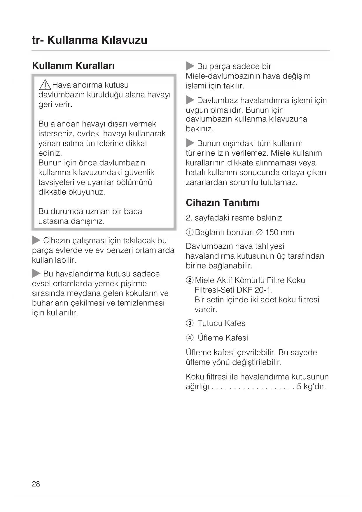 a Baðlantý borularý C 150 mm Davlumbazýn hava tahliyesi havalandýrma kutusunun üç tarafýndan birine baðlanabilir. b Miele Aktif Kömürlü Filtre Koku Filtresi-Seti DKF 20-1. Bir setin içinde iki adet koku filtresi vardir. c Tutucu Kafes d Üfleme Kafesi Üfleme kafesi çevrilebilir. Bu sayede üfleme yönü deðiþtirilebilir. Koku filtresi ile havalandýrma kutusunun aðýrlýðý ...................5kg'dýr. tr- Kullanma Kýlavuzu 28Fonksiyon Açýklamalarý Mutfakta çekilen hava yað filtresi içinde temizlenir ve havalandýrma kutusuna gönderilir. Burada hava koku filtresinde temizlenir ve mutfaða geri verilir. Koku filtresinin takýlmýþ olduðuna dikkat ediniz. Havalandýrma kutusu mutfakta sizin seçeceðiniz bir yere monte edilir. Davlumbazýn hava tahliyesi havalandýrma kutusu ile baðlantýlý olacaktýr. Klepe ve koku filtresi davlumbazýn içine takýlmaz. Davlumbazýn montajýnda montaj talimatýna dikkat ediniz. Montaj Yeri – Kutunun yerleþtirme yeri davlumbazda en az üç metre uzakta olmalýdýr. – Montaj yerini belirleyiniz ve havanýn engellenmeden kutudan akmasýný saðlayacak donanýmý hazýrlayýnýz. Hava akýmý doðrudan tavana veya duvara verilemez. – Hava akýmý davlumbaza doðru yönlendirilmemelidir. Havalandýrma kutusunun montajý 48. sayfadan itibaren yazýlýdýr. Havalandýrma kutusuna giden hava tahliyesi – Davlumbazýn havalandýrma kutusuna giden hava tahliyesi için düz veya esnek borular veya yanmayan maddeden yapýlmýþ hortumlar kullanýnýz. Mümkün olan en büyük hava tahliyesini saðlarken mümkün olduðu kadar az gürültü olmasýný saðlamak için þunlara dikkat edilmelidir: – Hava tahliye borularýnýn çapý 150 mm'den küçük olmamalýdýr. – Kullanýlan hava tahliye borularýnýn kesiti tahliye kanalý kesitinden daha dar olmamalýdýr. – Hava tahliye kanalý mümkün olduðunca kýsa ve düz olmalýdýr. – Geniþ çaplý dirsekler kullanýnýz. – Hava tahliye borularý eðri ve ezilmiþ olmamalýdýr. – Bütün baðlantýlarýn saðlam ve sýzdýrmaz olduðundan emin olunuz. – Hava tahliye borusu yatay olarak döþenecekse, her metre için 1 cm'lik bir eðim öngörülmelidir. Bununla kondense olmuþ suyun davlumbazýn içine kaçmasý önlenmiþ olur. tr- Kullanma Kýlavuzu 29Koku Filtresi Ýlk yerleþtirmede: ^ Davlumbazda koku filtresi için bir çalýþtýrma sayacý varsa , bunu devreye alýnýz. Bunun için davlumbazýn kullanma kýlavuzuna bakýnýz. Koku Filtresinin Deðiþtirilmesi Koku filtresini daima þu durumlarda deðiþtiriniz: – Çalýþtýrma sayacý-tuþunun koku filtresi sembolünün ýþýðý yandýðýnda (uygun donanýmlý davlumbazlarda), veya – Mutfaktaki kokularýn artýk yeterli derecede çekilemediðinde. En geç her 6 ayda bir deðiþtirilmelidir. – Saðlam ve düzgün duran bir merdiven kullanýnýz. – Merdivende emniyetli bir þekilde durmaya dikkat ediniz. ^ Üfleme kafesini açýnýz ve aþaðý doðru eðiniz. ^ Koku filtresinin kafesini sýký tutunuz ve kilidini açýnýz. ^ Kafesi aþaðý doðru eðerek dýþaýr alýnýz. tr- Kullanma Kýlavuzu 30^ Koku filtresini dýþarý çýkarýtnýz. ^ Ýki adet yeni koku filtresi takýnýz. ^ Tutucu kafesi tutucu düðmelerden tekrar içeri sürünüz ve kilidi kapatýnýz. ^ Üfleme kafesini kapatýnýz. Mýknatýslý kapak kapanýr. ^ Kullanýlmýþ eski koku filtresini evdeki çöpe atýnýz. Koku Filtresi Çalýþma Sayacýnýn Geri Alýnmasý ^ Eðer davlumbazda koku filtresi için bir çalýþtýrma sayacý varsa bunu filtreyi deðiþtirdikten sonra geri alýnýz. Bunun için davlumba kullanma kýlavuzuna bakýnýz. Kasanýn Temizliði ^ Üfleme kafesini ve koku filtreleri dýþarý alýndýktan sonra onlara ait hazneyi süngerli bir bezle, deterjan ve sýcak su ile temizleyiniz. tr- Kullanma Kýlavuzu 31Användningsområde