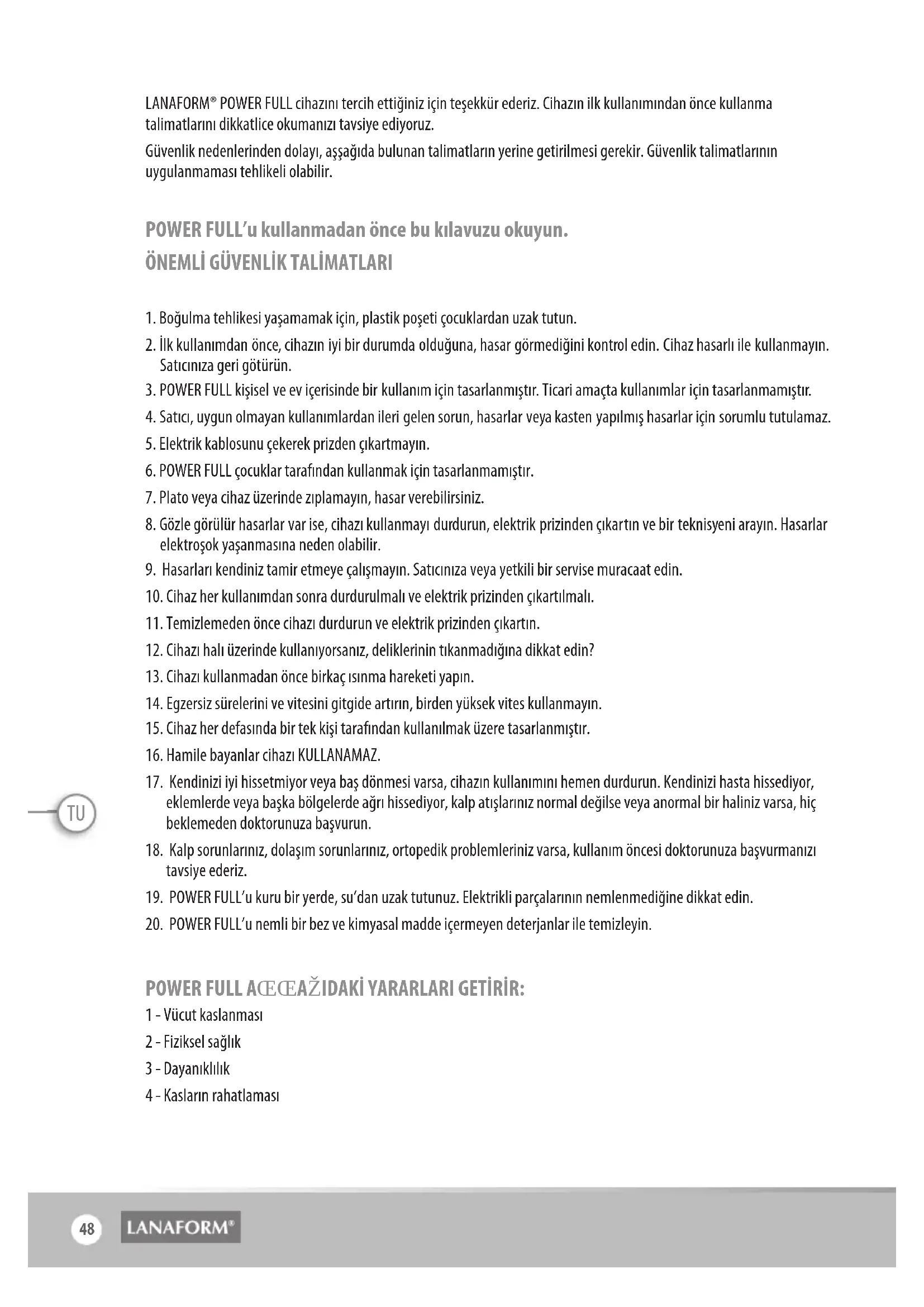 Power Full 47TU LANAFORM® POWER FULL cihazını tercih ettiğiniz için teşekkür ederiz. Cihazın ilk kullanımından önce kullanma talimatlarını dikkatlice okumanızı tavsiye ediyoruz. Güvenlik nedenlerinden dolayı, aşşağıda bulunan talimatların yerine getirilmesi gerekir. Güvenlik talimatlarının uygulanmaması tehlikeli olabilir. POWER FULL’u kullanmadan önce bu kılavuzu okuyun.