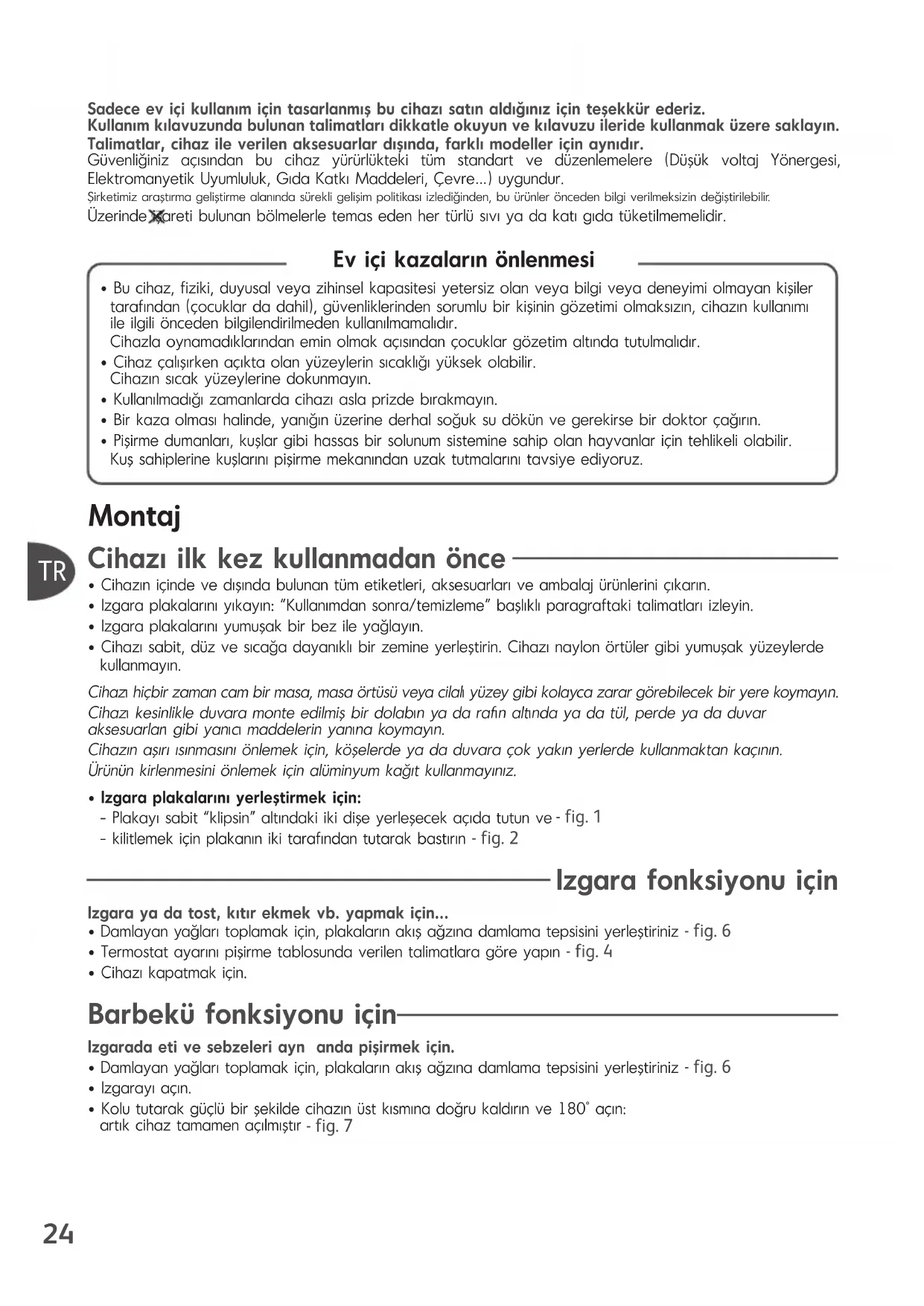 - Izgara plakalarn yerleştirmek için: - Plakay sabit “klipsin” altndaki iki dişe yerleşecek açda tutun ve - fig. 1 - kilitlemek için plakann iki tarafndan tutarak bastrn - fig. 2 Ev içi kazalarn önlenmesi Izgara fonksiyonu için Izgara ya da tost, ktr ekmek vb. yapmak için...