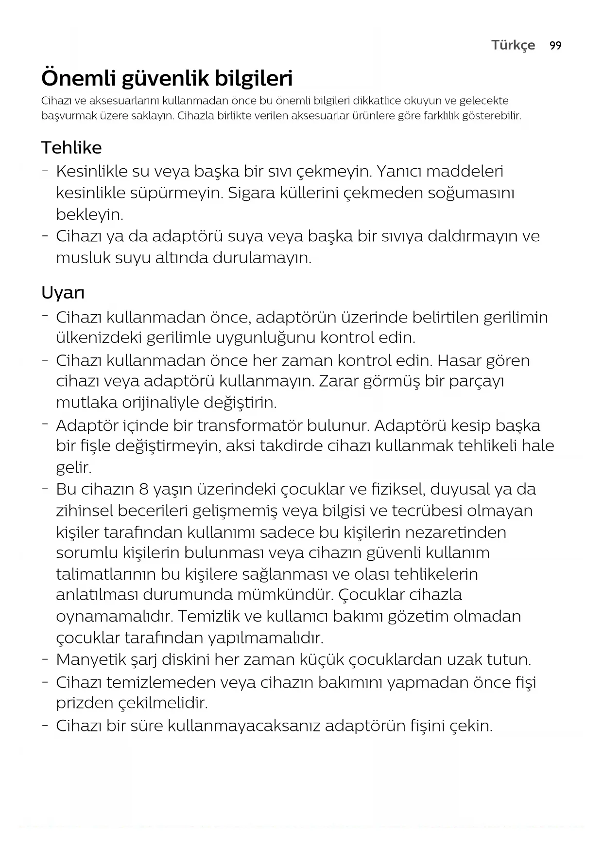 Cihazı ya da adaptörüsuya veya başka bir sıvıya daldırmayın ve musluk suyu altında durulamayın. Uyarı