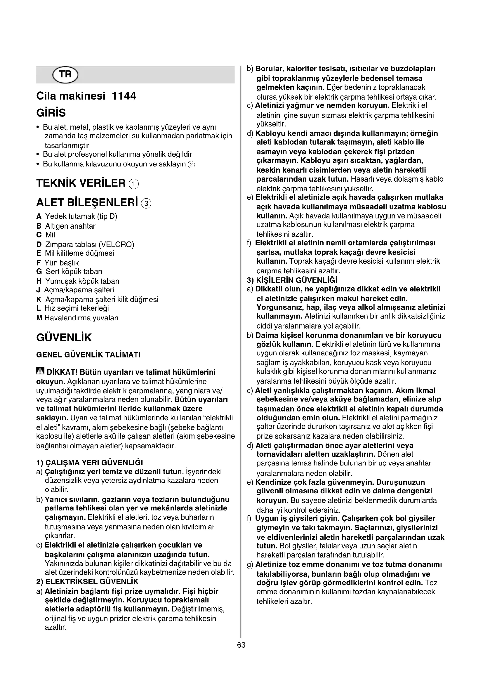 a) Bu elektrikli alet cila makinesi olarak tasarlanmistir. Elektrikli el aleti ile birlikte teslim edilen butun uyarilara, talimata, sekillere ve verilere uyun hareket edin. Asagidaki talimat hukumlerine uymadiginiz takdirde elektrik carpmasi, yangin veya agir yaralanma tehlikesi ile karslaasabilirsiniz.
