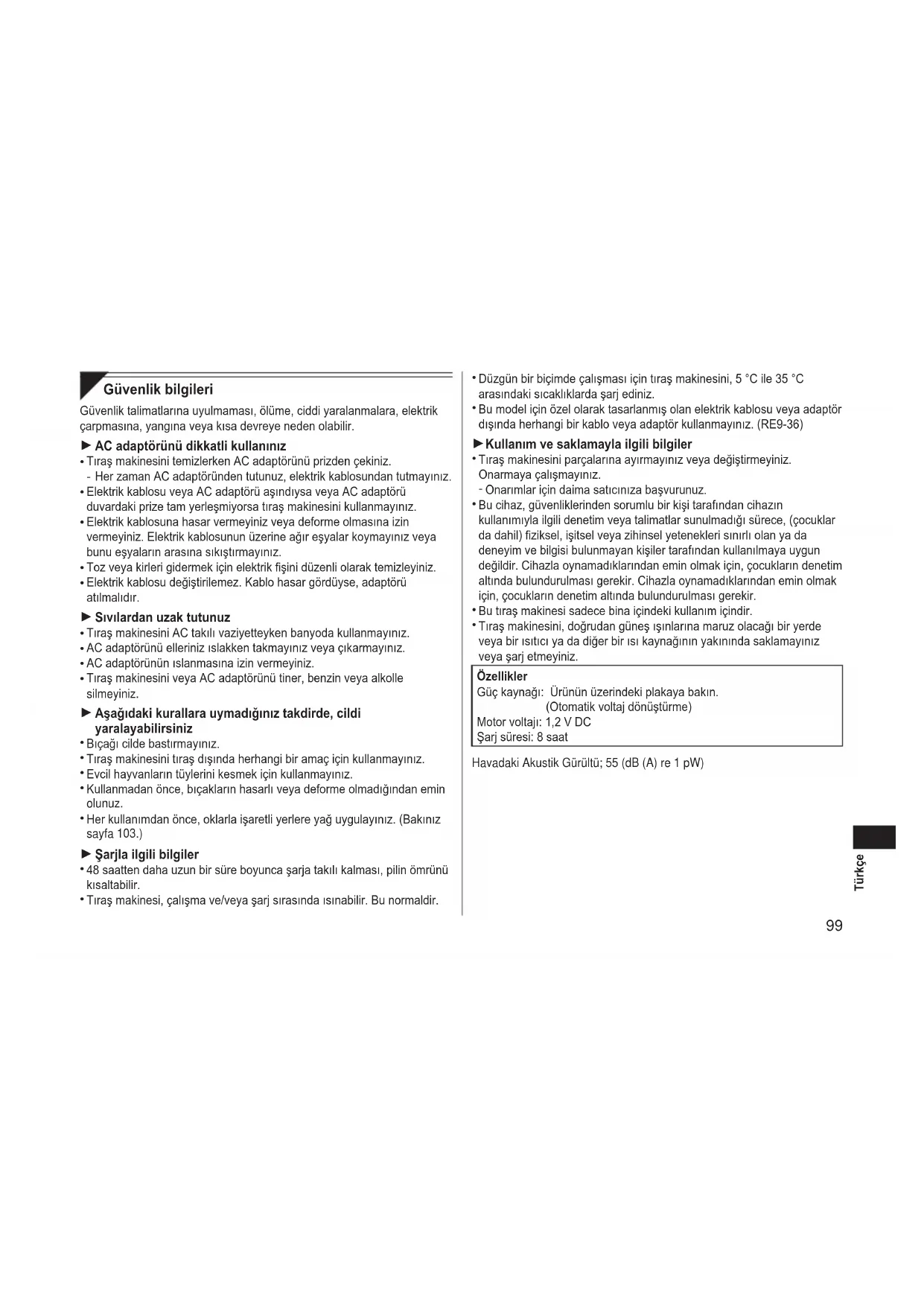 Düzgün bir biçimde çalışması için tıraş makinesini, 5 °C ile 35 °C arasındaki sıcaklıklarda şarj ediniz. Bu model için özel olarak tasarlanmış olan elektrik kablosu veya adaptör dışında herhangi bir kablo veya adaptör kullanmayınız. (RE9‑36) Kullanım ve saklamayla ilgili bilgiler Tıraş makinesini parçalarına ayırmayınız veya değiştirmeyiniz. Onarmaya çalışmayınız. Onarımlar için daima satıcınıza başvurunuz. Bu cihaz, güvenliklerinden sorumlu bir kişi tarafından cihazın kullanımıyla ilgili denetim veya talimatlar sunulmadığı sürece, (çocuklar da dahil) ziksel, işitsel veya zihinsel yetenekleri sınırlı olan ya da deneyim ve bilgisi bulunmayan kişiler tarafından kullanılmaya uygun değildir. Cihazla oynamadıklarından emin olmak için, çocukların denetim altında bulundurulması gerekir. Cihazla oynamadıklarından emin olmak için, çocukların denetim altında bulundurulması gerekir. Bu tıraş makinesi sadece bina içindeki kullanım içindir. Tıraş makinesini, doğrudan güneş ışınlarına maruz olacağı bir yerde veya bir ısıtıcı ya da diğer bir ısı kaynağının yakınında saklamayınız veya şarj etmeyiniz. Özellikler Güç kaynağı: Ürünün üzerindeki plakaya bakın. (Otomatik voltaj dönüştürme) Motor voltajı: 1,2 V DC Şarj süresi: 8 saat Havadaki Akustik Gürültü; 55 (dB (A) re 1 pW)