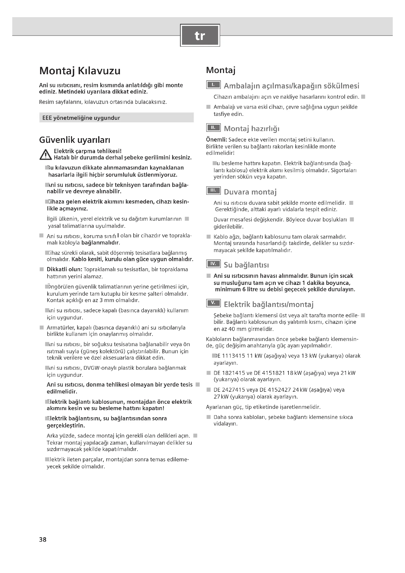 Montaj Kılavuzu Ani su ısıtıcısını, resim kısmında anlatıldığı gibi monte ediniz. Metindeki uyarılara dikkat ediniz.Resim sayfalarını, kılavuzun ortasında bulacaksınız.EEE yönetmeliğine uygundur Güvenlik uyarıları Elektrik çarpma tehlikesi!Hatalı bir durumda derhal şebeke gerilimini kesiniz.Bu kılavuzun dikkate alınmamasından kaynaklanan ■ hasarlarla ilgili hiçbir sorumluluk üstlenmiyoruz.Ani su ısıtıcısı, sadece bir teknisyen tarafından bağla- ■nabilir ve devreye alınabilir.Cihaza gelen elektrik akımını kesmeden, cihazı kesin- ■likle açmayınız.İlgili ülkenin, yerel elektrik ve su dağıtım kurumlarının ■ yasal talimatlarına uyulmalıdır.Ani su ısıtıcısı, koruma sınıfı ■ I olan bir cihazdır ve toprakla- malı kabloyla bağlanmalıdır.Cihaz sürekli olarak, sabit döşenmiş tesisatlara bağlanmış ■olmalıdır. Kablo kesiti, kurulu olan güce uygun olmalıdır. Dikkatli olun: ■ Topraklamalı su tesisatları, bir topraklama hattının yerini alamaz.Öngörülen güvenlik talimatlarının yerine getirilmesi için, ■kurulum yerinde tam kutuplu bir kesme şalteri olmalıdır. Kontak açıklığı en az 3 mm olmalıdır.Ani su ısıtıcısı, sadece kapalı (basınca dayanıklı) kullanım ■için uygundur. Armatürler, kapalı (basınca dayanıklı) ani su ısıtıcılarıyla ■ birlikte kullanım için onaylanmış olmalıdır.Ani su ısıtıcısı, bir soğuksu tesisatına bağlanabilir veya ön ■ısıtmalı suyla (güneş kolektörü) çalıştırılabilir. Bunun için teknik verilere ve özel aksesuarlara dikkat edin.Ani su ısıtıcısı, DVGW-onaylı plastik borulara bağlanmak ■için uygundur.Ani su ısıtıcısı, donma tehlikesi olmayan bir yerde tesis ■edilmelidir.Elektrik bağlantı kablosunun, montajdan önce elektrik ■akımını kesin ve su besleme hattını kapatın!Elektrik bağlantısını, su bağlantısından sonra ■gerçekleştirin.Arka yüzde, sadece montaj için gerekli olan delikleri açın. ■Tekrar montaj yapılacağı zaman, kullanılmayan delikler su sızdırmayacak şekilde kapatılmalıdır.Elektrik ileten parçalar, montajdan sonra temas edileme- ■yecek şekilde olmalıdır. Montaj
