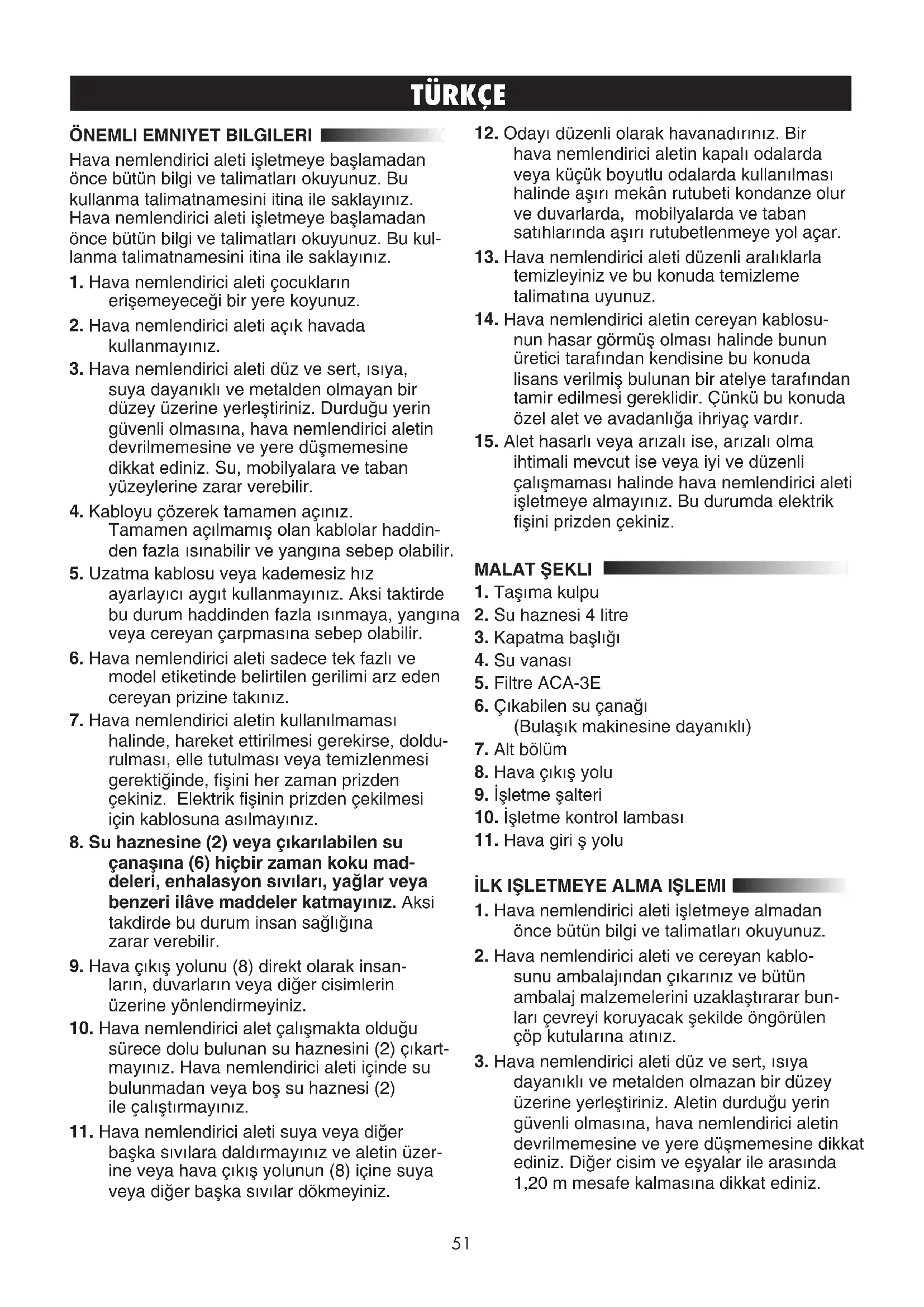 ihtimali mevcut ise veya iyi ve düzenli çalıflmaması halinde hava nemlendirici aleti iflletmeye almayınız. Bu durumda elektrik fiflini prizden çekiniz. MALAT fiEKLI