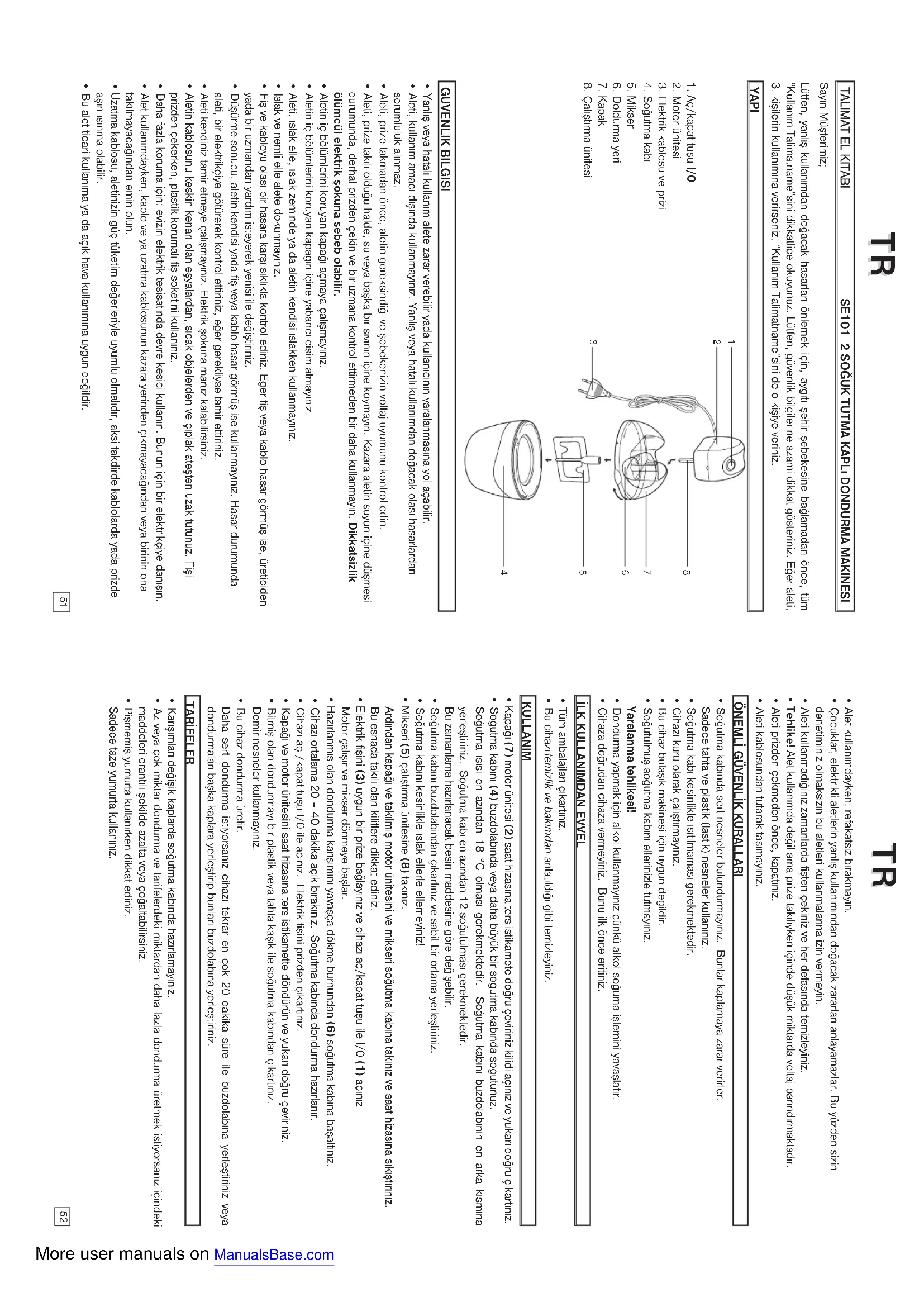 SE101 2 SOÐUK TUTMA KAPLý DONDURMA MAKINESI Sayýn Müþterimiz;Lütfen, yanlýþ kullanýmdan doðacak hasarlarý önlemek için, aygýtý þehir þebekesine baðlamadan önce, tüm“Kullaným Talimatname”sini dikkatlice okuyunuz. Lütfen, güvenlik bilgilerine azami dikkat gösteriniz. Eðer aleti,3. kiþilerin kullanýmýna verirseniz, “Kullaným Talimatname”sini de o kiþiye veriniz. YAPI 1. Aç/kapat tuþu I/02. Motor ünitesi3. Elektrik kablosu ve prizi4. Soðutma kabý5. Mikser6. Doldurma yeri7. Kapak 8. Çalýþtýrma ünitesi GUVENLIK BILGISI