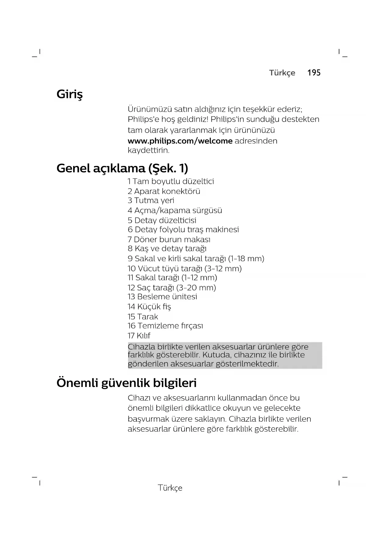 SvenskaTürkçe Giriş Ürünümüzü satın aldığınız için teşekkür ederiz; Philips'e hoş geldiniz! Philips'in sunduğu destekten tam olarak yararlanmak için ürününüzü www.philips.com/welcome adresinden kaydettirin. Genel açıklama (Şek. 1) 1 Tam boyutlu düzeltici 2 Aparat konektörü 3 Tutma yeri 4 Açma/kapama sürgüsü 5 Detay düzelticisi 6 Detay folyolu tıraş makinesi 7 Döner burun makası 8 Kaş ve detay tarağı 9 Sakal ve kirli sakal tarağı (1-18 mm) 10 Vücut tüyü tarağı (3-12 mm) 11 Sakal tarağı (1-12 mm) 12 Saç tarağı (3-20 mm) 13 Besleme ünitesi 14 Küçük fiş 15 Tarak 16 Temizleme fırçası 17 Kılıf Cihazla birlikte verilen aksesuarlar ürünlere göre farklılık gösterebilir. Kutuda, cihazınız ile birlikte gönderilen aksesuarlar gösterilmektedir. Önemli güvenlik bilgileri Cihazı ve aksesuarlarını kullanmadan önce bu önemli bilgileri dikkatlice okuyun ve gelecekte başvurmak üzere saklayın. Cihazla birlikte verilen aksesuarlar ürünlere göre farklılık gösterebilir.