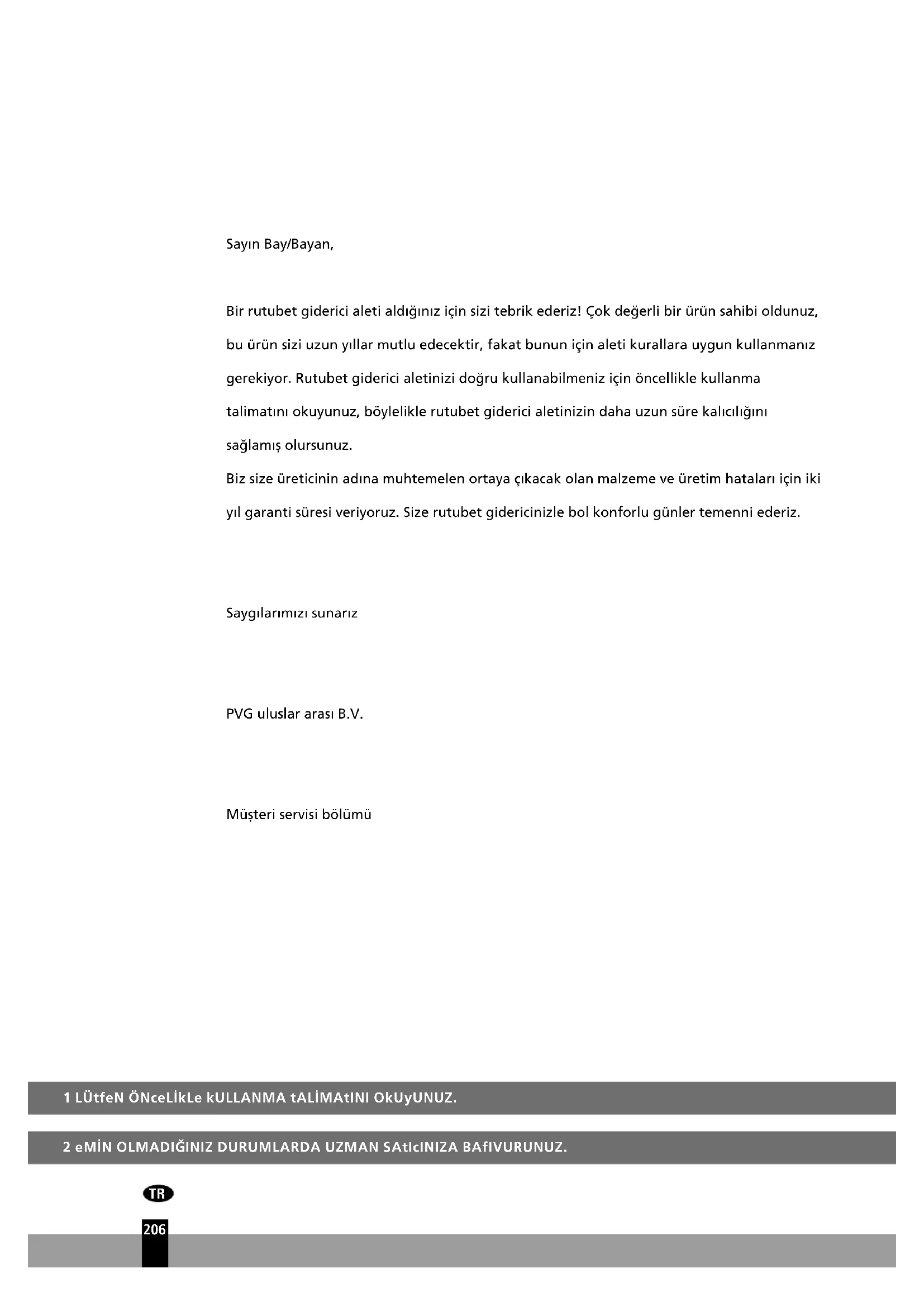 Sayın Bay/Bayan, Bir rutubet giderici aleti aldığınız için sizi tebrik ederiz! Çok değerli bir ürün sahibi oldunuz, bu ürün sizi uzun yıllar mutlu edecektir, fakat bunun için aleti kurallara uygun kullanmanız gerekiyor. Rutubet giderici aletinizi doğru kullanabilmeniz için öncellikle kullanma talimatını okuyunuz, böylelikle rutubet giderici aletinizin daha uzun süre kalıcılığını sağlamıș olursunuz. Biz size üreticinin adına muhtemelen ortaya çıkacak olan malzeme ve üretim hataları için iki yıl garanti süresi veriyoruz. Size rutubet gidericinizle bol konforlu günler temenni ederiz. Saygılarımızı sunarız PVG uluslar arası B.V. Müșteri servisi bölümüTEMEL YAPI PARÇALARI Kumanda klavyesi Kuru hava için çıkıș yeri Çıkartılabilen su deposu Nemli hava için giriș yeri Hava filtresi Kapaklı çıkıș Fiș ve kablo Sap (kol) Drenaj su borusu Çıkış Havalandırma Kapağı Gösterge ışığı Güç kablosu sarma yeri