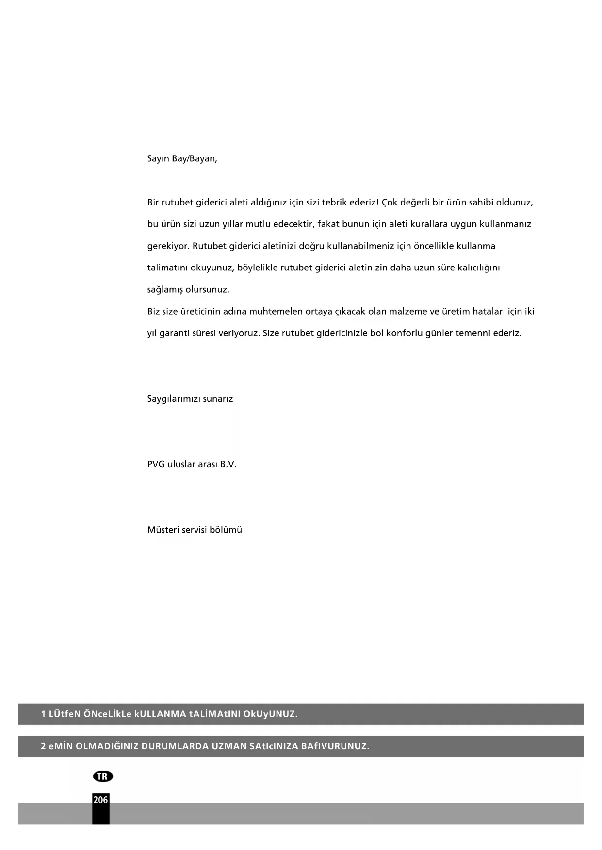 Sayın Bay/Bayan, Bir rutubet giderici aleti aldığınız için sizi tebrik ederiz! Çok değerli bir ürün sahibi oldunuz, bu ürün sizi uzun yıllar mutlu edecektir, fakat bunun için aleti kurallara uygun kullanmanız gerekiyor. Rutubet giderici aletinizi doğru kullanabilmeniz için öncellikle kullanma talimatını okuyunuz, böylelikle rutubet giderici aletinizin daha uzun süre kalıcılığını sağlamıș olursunuz. Biz size üreticinin adına muhtemelen ortaya çıkacak olan malzeme ve üretim hataları için iki yıl garanti süresi veriyoruz. Size rutubet gidericinizle bol konforlu günler temenni ederiz. Saygılarımızı sunarız PVG uluslar arası B.V. Müșteri servisi bölümüTEMEL YAPI PARÇALARI Kumanda klavyesi Kuru hava için çıkıș yeri Çıkartılabilen su deposu Nemli hava için giriș yeri Hava filtresi Kapaklı çıkıș Fiș ve kablo Sap (kol) Drenaj su borusu Çıkış Havalandırma Kapağı Gösterge ışığı Güç kablosu sarma yeri