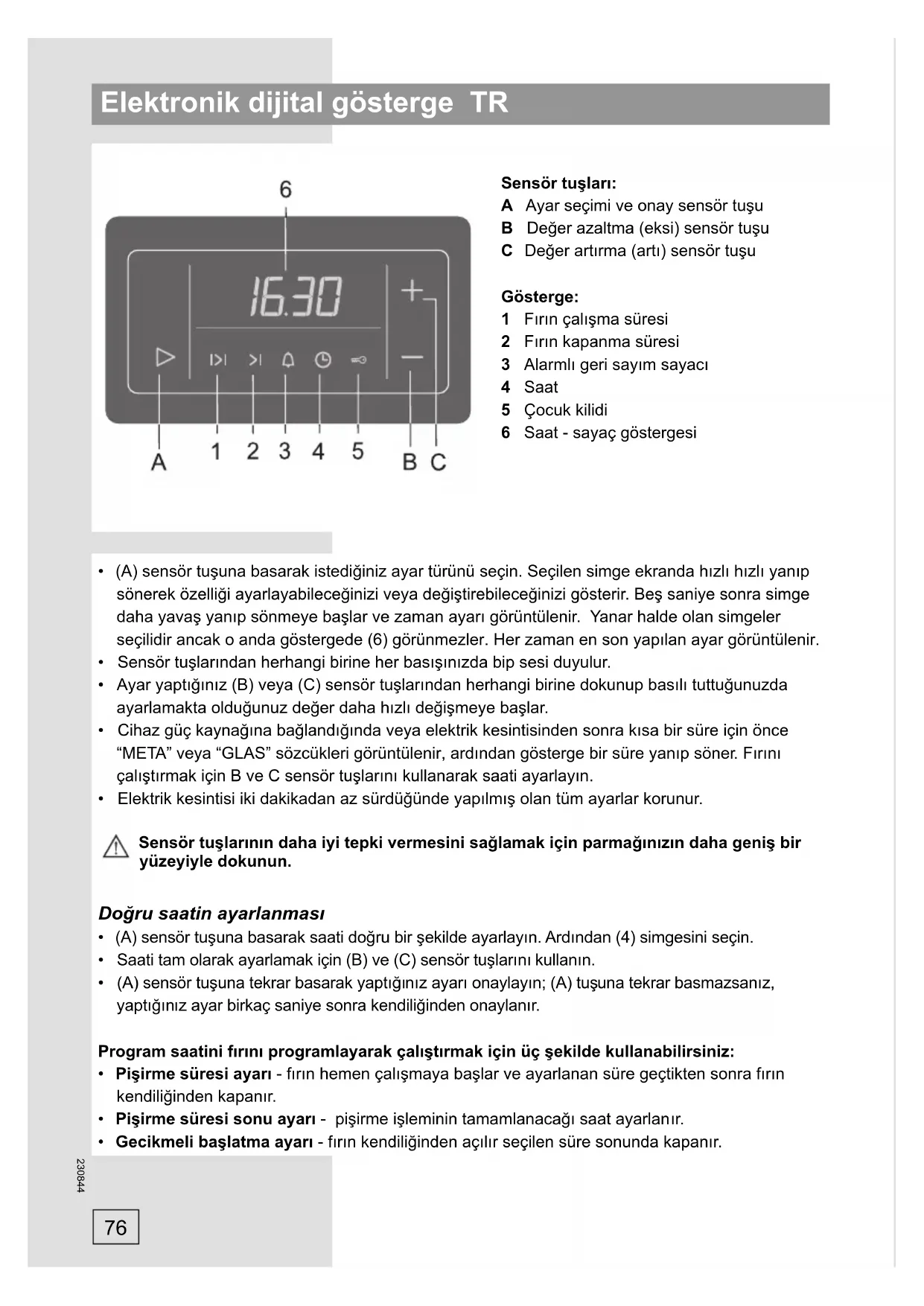 Sensör tuşları: A Ayar seçimi ve onay sensör tuşu B Değer azaltma (eksi) sensör tuşu C Değer artırma (artı) sensör tuşu Gösterge: 1 Fırın çalışma süresi 2 Fırın kapanma süresi 3 Alarmlı geri sayım sayacı 4 Saat 5 Çocuk kilidi 6 Saat - sayaç göstergesi
