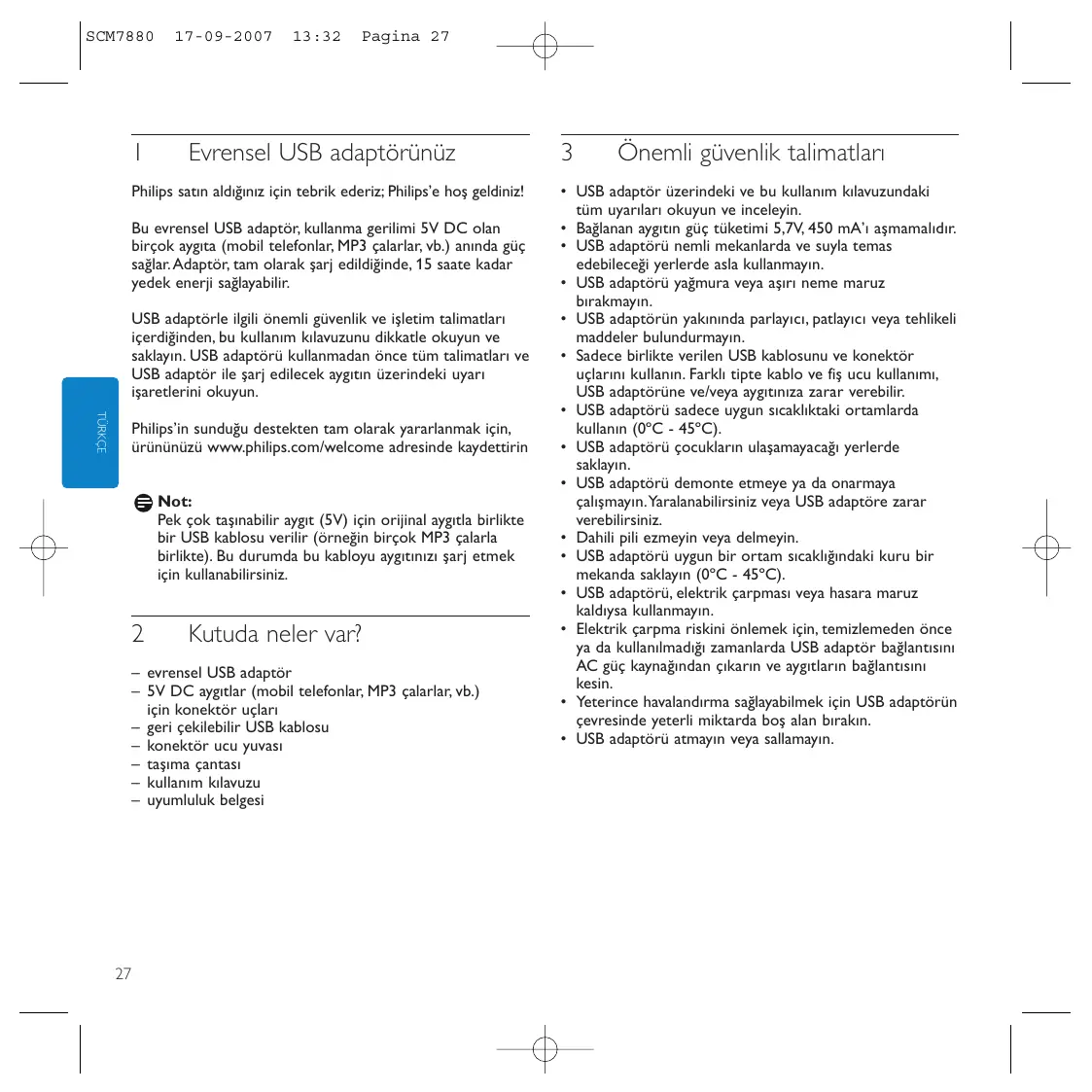 USB adaptörle ilgili onemli güvenlik ve iletim talimatlari icerdirigenden, bu kullanim kilavuzunu dikkatle okuyun ve saklayin. USB adaptörü kullanmadan.Once tem talimatlari ve USB adaptorör ile sär edilecek aygün üzerindeki uyari isaretlerini okuyun.
