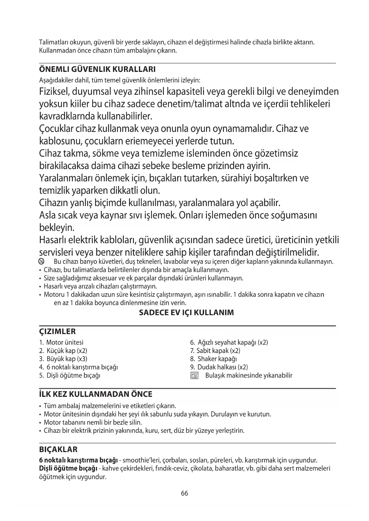 Aşağıdakiler dahil, tüm temel güvenlik önlemlerini izleyin: Fiziksel, duyumsal veya zihinsel kapasiteli veya gerekli bilgi ve deneyimden yoksun kiiler bu cihaz sadece denetim/talimat altnda ve içerdii tehlikeleri kavradklarnda kullanabilirler. Çocuklar cihaz kullanmak veya onunla oyun oynamamalıdır. Cihaz ve kablosunu, çocuklarn eriemeyecei yerlerde tutun. Cihaz takma, sökme veya temizleme isleminden önce gözetimsiz birakilacaksa daima cihazi sebeke besleme prizinden ayirin. Yaralanmaları önlemek için, bıçakları tutarken, sürahiyi boşaltırken ve temizlik yaparken dikkatli olun. Cihazın yanlış biçimde kullanılması, yaralanmalara yol açabilir. Asla sıcak veya kaynar sıvı işlemek. Onları işlemeden önce soğumasını bekleyin. Hasarlı elektrik kabloları, güvenlik açısından sadece üretici, üreticinin yetkili servisleri veya benzer niteliklere sahip kişiler tarafından değiştirilmelidir.