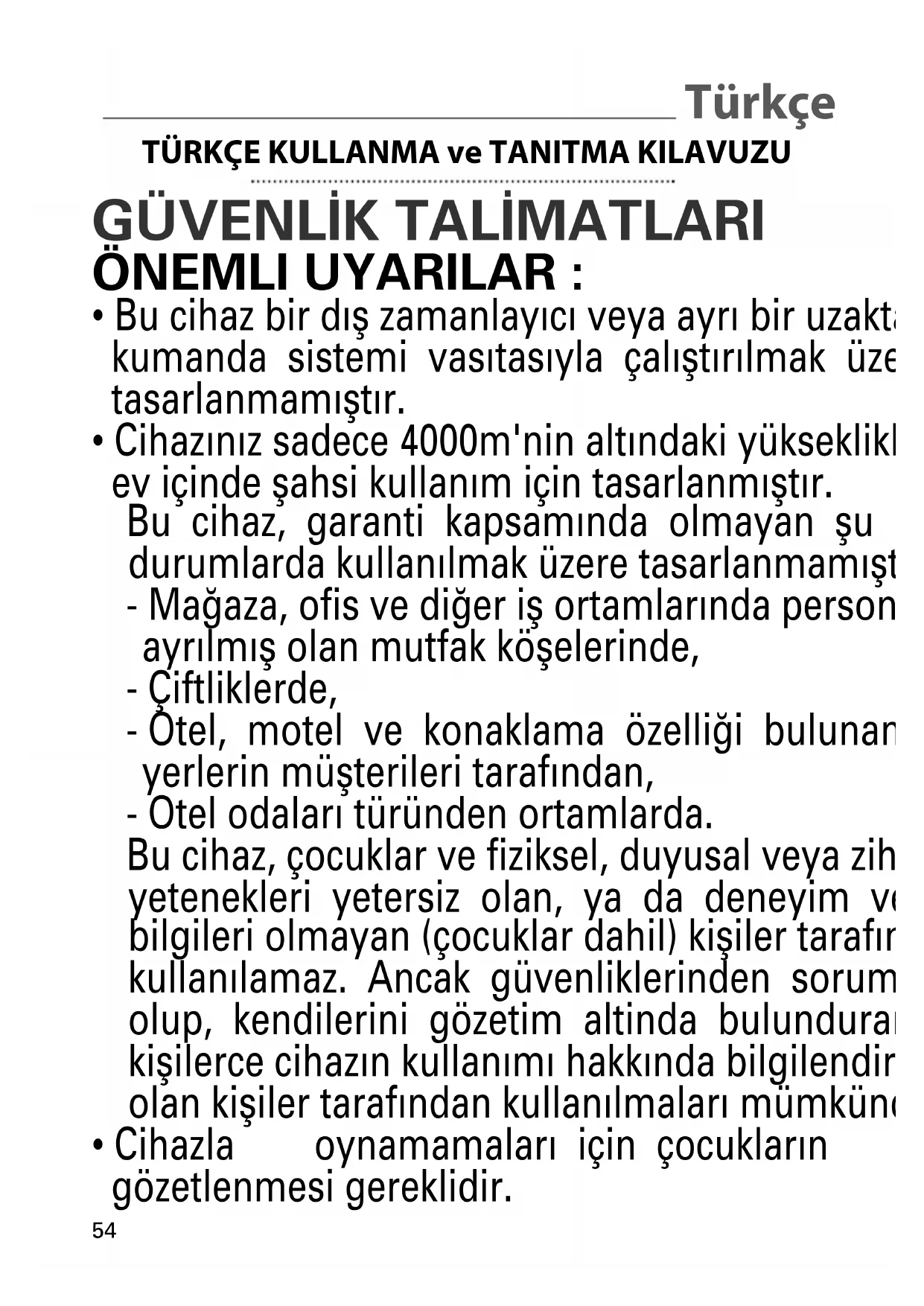- Cihazınız sadece 4000m'nin altındaki yüksekliklerde ev içinde şahsi kullanım için tasarlanmıştır. Bu cihaz, garanti kapsamında olmayan şu durumlarda kullanılmak üzere tasarlanmamıştır: - Mağaza, ofis ve diğer iş ortamlarında personele ayrılmış olan mutfak köşelerinde, - Çiftliklerde, - Otel, motel ve konaklama özelliği bulunan yerlerin müşterileri tarafından, - Otel odaları türünden ortamlarda. Bu cihaz, çocuklar ve fiziksel, duyusal veya zihinsel yetenekleri yetersiz olan, ya da deneyim ve bilgileri olmayan (çocuklar dahil) kişiler taraf7ndan kullan7lamaz. Ancak güvenliklerinden sorumlu olup, kendilerini gözetim altinda bulunduran kişilerce cihaz7n kullan7m7 hakk7nda bilgilendirilmiş olan kişiler taraf7ndan kullan7lmalar7 mümkündür.