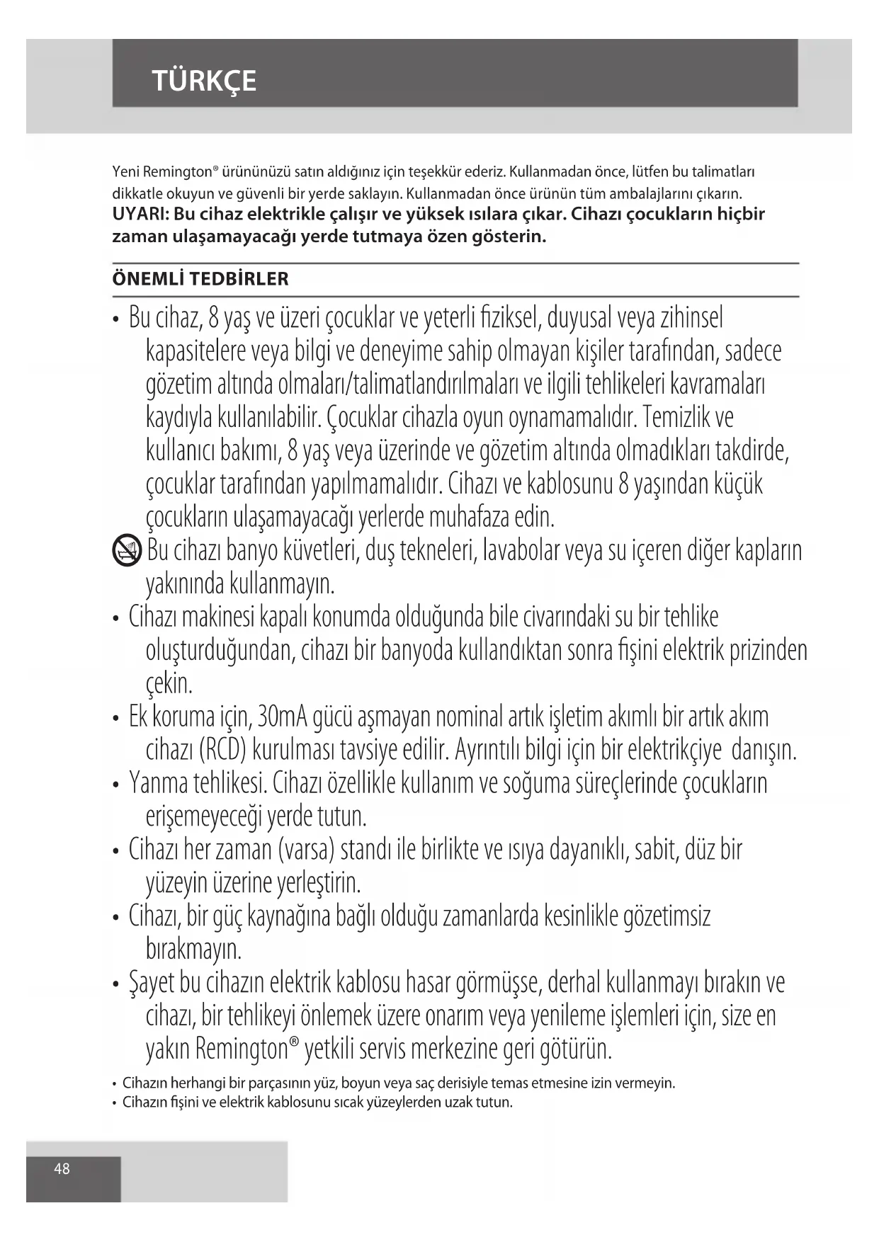 Yeni Remington® ürününüzü satın aldığınız için teşekkür ederiz. Kullanmadan önce, lütfen bu talimatları dikkatle okuyun ve güvenli bir yerde saklayın. Kullanmadan önce ürünün tüm ambalajlarını çıkarın. UYARI: Bu cihaz elektrikle çalışır ve yüksek ısılara çıkar. Cihazı çocukların hiçbir zaman ulaşamayacağı yerde tutmaya özen gösterin.