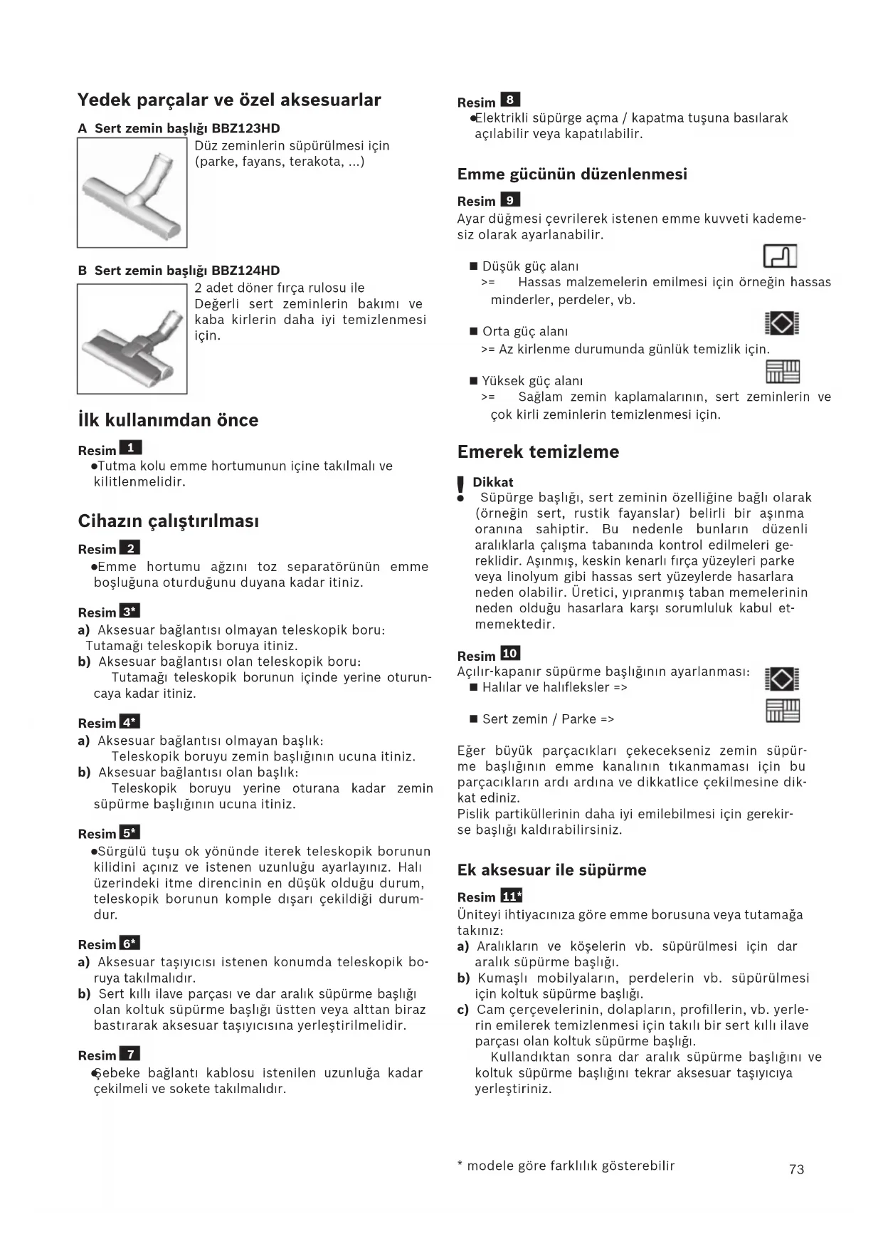 - modele göre farklılık gösterebilir74 d) Profesyonel dar aralık süpürme başlığı Örneğin araba vb. bir yerdeki olukların, köşelerin ve dar ara bölmelerin temizlenmesi için ekstra uzun dar aralık süpürme başlığı. e) Profesyonel koltuk süpürme başlığı Döşemelik kumaştan mobilyaların, perdelerin vb. eşyaların kolay ve iyi temizlenmesi için. Profesyonel koltuk süpürme başlığı, temizlenmesi için kolaylıkla tutamağından tutularak emilebilir. f) Sert yer kaplamalarının emilerek temizlenmesi için sert zemin başlığını (fayans, parke vb.) Sert zemin başlığının temizlenmesi Resim 12* a) Süpürge başlığını temizlerken tozu alttan emdirerek temizleyiniz. b) Birikmiş tüyler ve kıllar makas kullanılarak kesilmeli ve süpürgeyle çekilmelidir. Matkap ucu başlığı Resim 13* a) Delikler için başlık tutamağa sabitlenmelidir ve başlıktaki boşluğun duvardaki boşluklara oturması için delik alanı duvara yerleştirilmelidir. b) Cihaz düşük güç kademesine ayarlanmalı ve ardından açılmalıdır. c) Delikler için başlık emme gücüyle istenen pozisyona tutulur. Delikli duvarın yüzey durumuna göre deli- kler için başlığın tam emmesini sağlamak için bir süre sonra güç daha yükseğe ayarlanır. Deliklerdeki tozlar otomatik olarak emilir. Resim