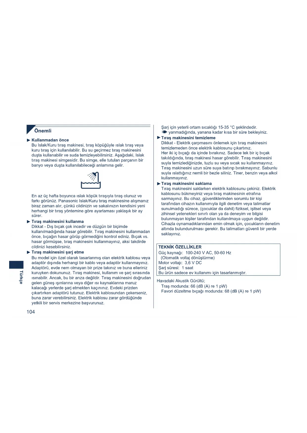 Güç kaynağı: 100-240 V AC, 50-60 Hz (Otomatik voltaj dönüştürme) Motor voltajı: 3,6 V DC Şarj süresi: 1 saat Bu ürün sadece ev kullanımı için tasarlanmıştır. Havadaki Akustik Gürültü; Traş modunda: 66 (dB (A) re 1 pW) Favori düzeltme bıçağı modunda: 68 (dB (A) re 1 pW)