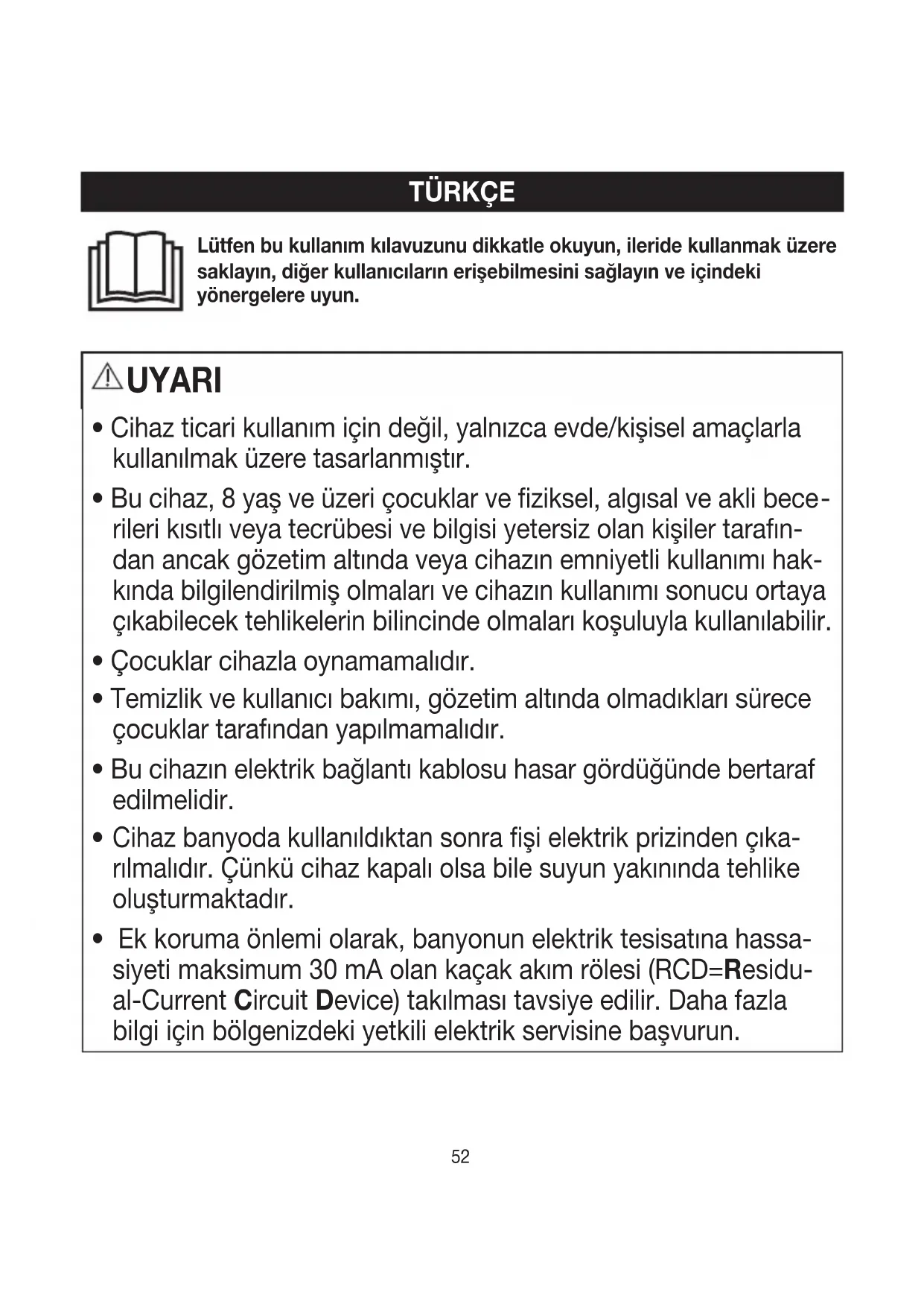 - Ek koruma önlemi olarak, banyonun elektrik tesisatına hassa- siyeti maksimum 30 mA olan kaçak akım rölesi (RCD=Residu- al-Current Circuit Device) takılması tavsiye edilir. Daha fazla bilgi için bölgenizdeki yetkili elektrik servisine başvurun. Lütfen bu kullanım kılavuzunu dikkatle okuyun, ileride kullanmak üzere saklayın, diğer kullanıcıların erişebilmesini sağlayın ve içindeki yönergelere uyun.52 53