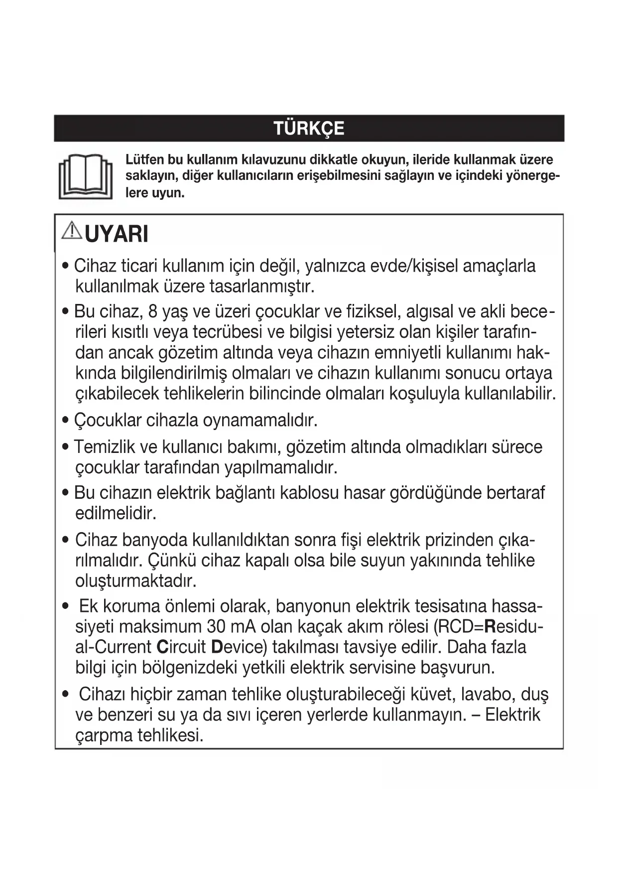 - Cihaz banyoda kullanıldıktan sonra:fisi elektrik prisinden Türkiye oluzlmaldir. Ünkü cihaz kapalı olsa bile suyun)yakıninda tehlük oluzlumaktadir.