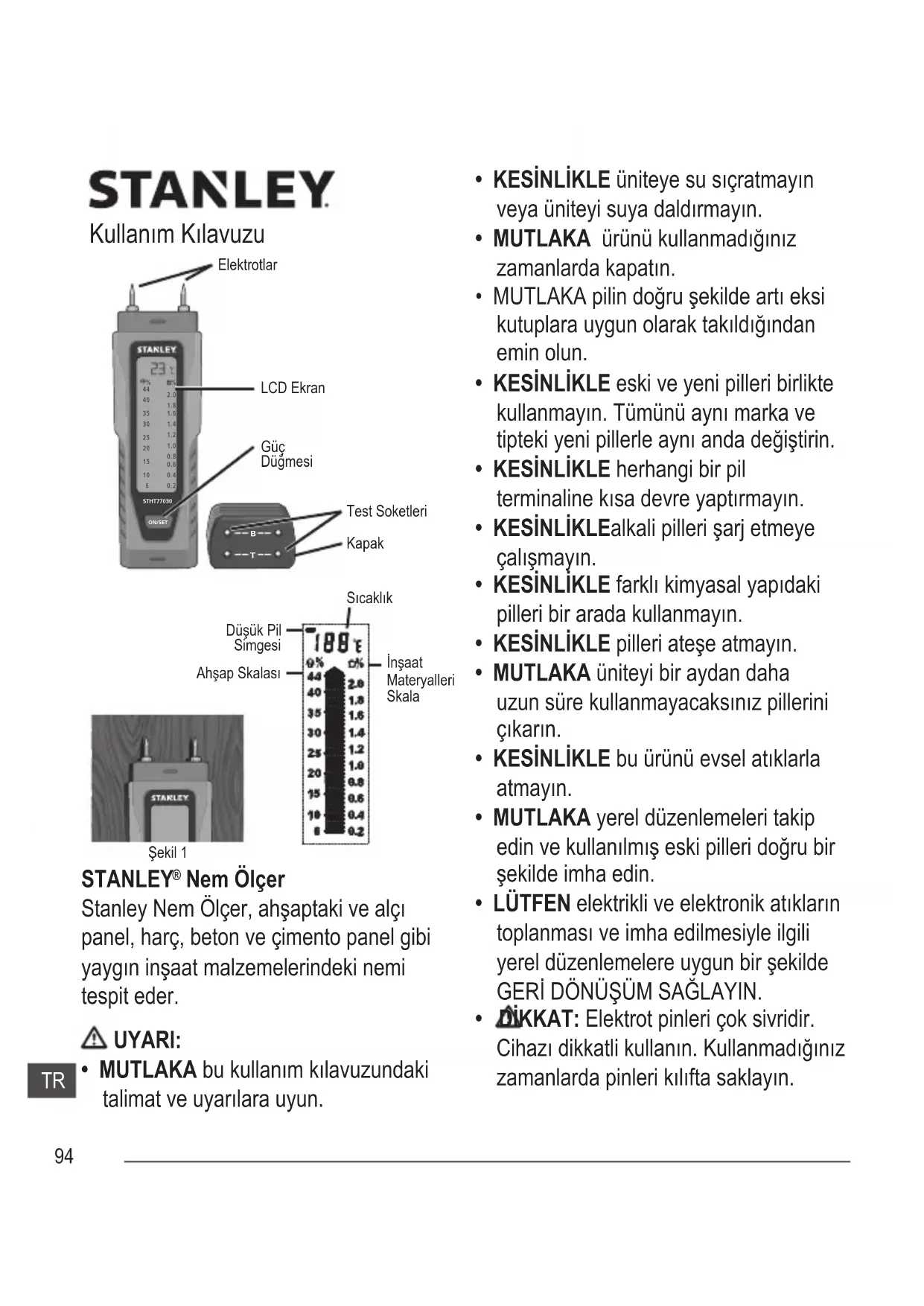 Stanley, elektronik ölçüm cihazlıkın malzeme ve/veya,isçilik hataları karı satın alma tarihinden itibaren bir yı garanti vermektedir.