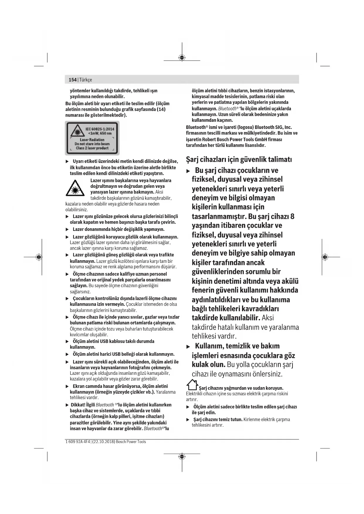 Τα όργανα μέτρησης, τα εξαρτήματα και οι συσκευασίες πρέπει να ανακυκλώνονται με τρόπο φιλικό προς το περιβάλλον. Μη ρίχνετε τα όργανα μέτρησης στα απορρίμματα του σπιτιού σας! Μόνο για χώρες τηςΕΕ: Σύμφωνα με την Ευρωπαϊκή οδηγία 2012/19/ΕΕ τα άχρηστα όργανα μέτρησης και σύμφωνα με την Ευρωπαϊκή οδηγία 2006/66/ΕΚ οι χαλασμένες ή χρησιμοποιημένες μπαταρίες δεν είναι πλέον υποχρεωτικό να συλλέγονται ξεχωριστά για να ανακυκλωθούν με τρόπο φιλικό προς το περιβάλλον. Μπαταρίες/Επαναφορτιζόμενες μπαταρίες: u Οι ενσωματωμένες μπαταρίες επιτρέπεται να αφαιρεθούν για την απόσυρση μόνο από ειδικευμένο προσωπικό. Με το άνοιγμα του κελύφους του περιβλήματος μπορεί να καταστραφεί το όργανο μέτρησης. Προτού αφαιρέσετε την μπαταρία, φροντίστε, να είναι η μπαταρία εντελώς εκφορτισμένη. Προτού αφαιρέσετε την μπαταρία, φροντίστε, να είναι η μπαταρία εντελώς εκφορτισμένη. Απομακρύνετε την πινακίδα τύπου, ανοίξτε την ακίδα μέτρησης και απομακρύνετε όλες τις βίδες στην πίσω πλευρά του περιβλήματος. Αφαιρέστε το κέλυφος του περιβλήματος, αποσυνδέστε όλα τα καλώδια από την πλακέτα και λύστε τις βίδες. Τώρα μπορείτε να αφαιρέσετε την πλακέτα και η μπαταρία είναι ορατή. Λύστε τις δύο βίδες και αφαιρέστε την μπαταρία για την ενδεδειγμένη απόσυρση. Επίσης και σε πλήρη αποφόρτιση υπάρχει ακόμη ένα υπόλοιπο φορτίο στην μπαταρία, που σε περίπτωση βραχυκυκλώματος μπορεί να ελευθερωθεί. Να μην ρίχνετε τις μπαταρίες στα απορρίμματα του σπιτιού σας, στη φωτιά ή στο νερό. Οι μπαταρίες πρέπει, κατά το δυνατό εκφορτισμένες, να συλλέγονται, να ανακυκλώνονται ή να αποσύρονται με τρόπο φιλικό προς το περιβάλλον. Türkçe Güvenlik talimatı Ölçüm aleti ile tehlikesiz ve güvenli biçimde çalışabilmek için bütün güvenlik talimatı ve uyarılar okunmalıdır. Ölçüm aleti bu güvenlik talimatına uygun olarak kullanılmazsa, ölçüm aletine entegre koruyucu donanımların işlevi kısıtlanabilir. Ölçüm aleti üzerindeki uyarı etiketlerini hiçbir zaman görünmez duruma getirmeyin. BU TALİMATLARI İYİ VE GÜVENLİ BİR YERDE SAKLAYIN VE ÖLÇÜM ALETİNİ BAŞKASINA VERDİĞİNİZDE BUNLARI DA BİRLİKTE VERİN. u Dikkat – Burada anılan kullanım ve ayar donanımlarından farklı donanımlar veya farklı Türkçe | 153 Bosch Power Tools 1 609 92A 4F4 | (22.10.2018)154 | Türkçe 1 609 92A 4F4 | (22.10.2018) Bosch Power Tools yöntemler kullanıldığı takdirde, tehlikeli ışın yayılımına neden olunabilir. Bu ölçüm aleti bir uyarı etiketi ile teslim edilir (ölçüm aletinin resminin bulunduğu grafik sayfasında (14) numarası ile gösterilmektedir). u Uyarı etiketi üzerindeki metin kendi dilinizde değilse, ilk kullanımdan önce bu etiketin üzerine aletle birlikte teslim edilen kendi dilinizdeki etiketi yapıştırın. Lazer ışınını başkalarına veya hayvanlara doğrultmayın ve doğrudan gelen veya yansıyan lazer ışınına bakmayın. Aksi takdirde başkalarının gözünü kamaştırabilir, kazalara neden olabilir veya gözlerde hasara neden olabilirsiniz. u Lazer ışını gözünüze gelecek olursa gözlerinizi bilinçli olarak kapatın ve hemen başınızı başka tarafa çevirin. u Lazer donanımında hiçbir değişiklik yapmayın. u Lazer gözlüğünü koruyucu gözlük olarak kullanmayın. Lazer gözlüğü lazer ışınının daha iyi görülmesini sağlar, ancak lazer ışınına karşı koruma sağlamaz. u Lazer gözlüğünü güneş gözlüğü olarak veya trafikte kullanmayın. Lazer gözlü kızılötesi ışınlara karşı tam bir koruma sağlamaz ve renk algılama performansını düşürür. u Ölçme cihazının sadece kalifiye uzman personel tarafından ve orijinal yedek parçalarla onarılmasını sağlayın. Bu sayede ölçme cihazının güvenliğini sağlarsınız. u Çocukların kontrolünüz dışında lazerli ölçme cihazını kullanmasına izin vermeyin. Çocuklar istemeden de olsa başkalarının gözlerini kamaştırabilir. u Ölçme cihazı ile içinde yanıcı sıvılar, gazlar veya tozlar bulunan patlama riski bulunan ortamlarda çalışmayın. Ölçme cihazı içinde tozu veya buharları tutuşturabilecek kıvılcımlar oluşabilir. u Ölçüm aletini USB kablosu takılı durumda kullanmayın. u Ölçüm aletini harici USB belleği olarak kullanmayın. u Lazer ışını sürekli açık olabileceğinden, ölçüm aleti ile insanların veya hayvanlarının fotoğrafını çekmeyin. Lazer ışını açık olduğunda insanların gözü kamaşabilir, kazalara yol açılabilir veya gözler zarar görebilir. u Ekran camında hasar görünüyorsa, ölçüm aletini kullanmayın (örneğin yüzeyde çizikler vb.). Yaralanma tehlikesi vardır. u Dikkat! İlgi