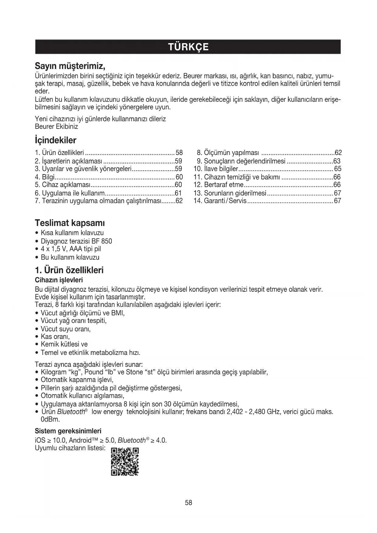 ≥ 4.0. Uyumlu cihazların listesi: Sayın müşterimiz, Ürünlerimizden birini seçtiğiniz için teşekkür ederiz. Beurer markası, ısı, ağırlık, kan basıncı, nabız, yumu- şak terapi, masaj, güzellik, bebek ve hava konularında değerli ve titizce kontrol edilen kaliteli ürünleri temsil eder. Lütfen bu kullanım kılavuzunu dikkatle okuyun, ileride gerekebileceği için saklayın, diğer kullanıcıların erişe- bilmesini sağlayın ve içindeki yönergelere uyun. Yeni cihazınızı iyi günlerde kullanmanızı dileriz Beurer Ekibiniz İçindekiler