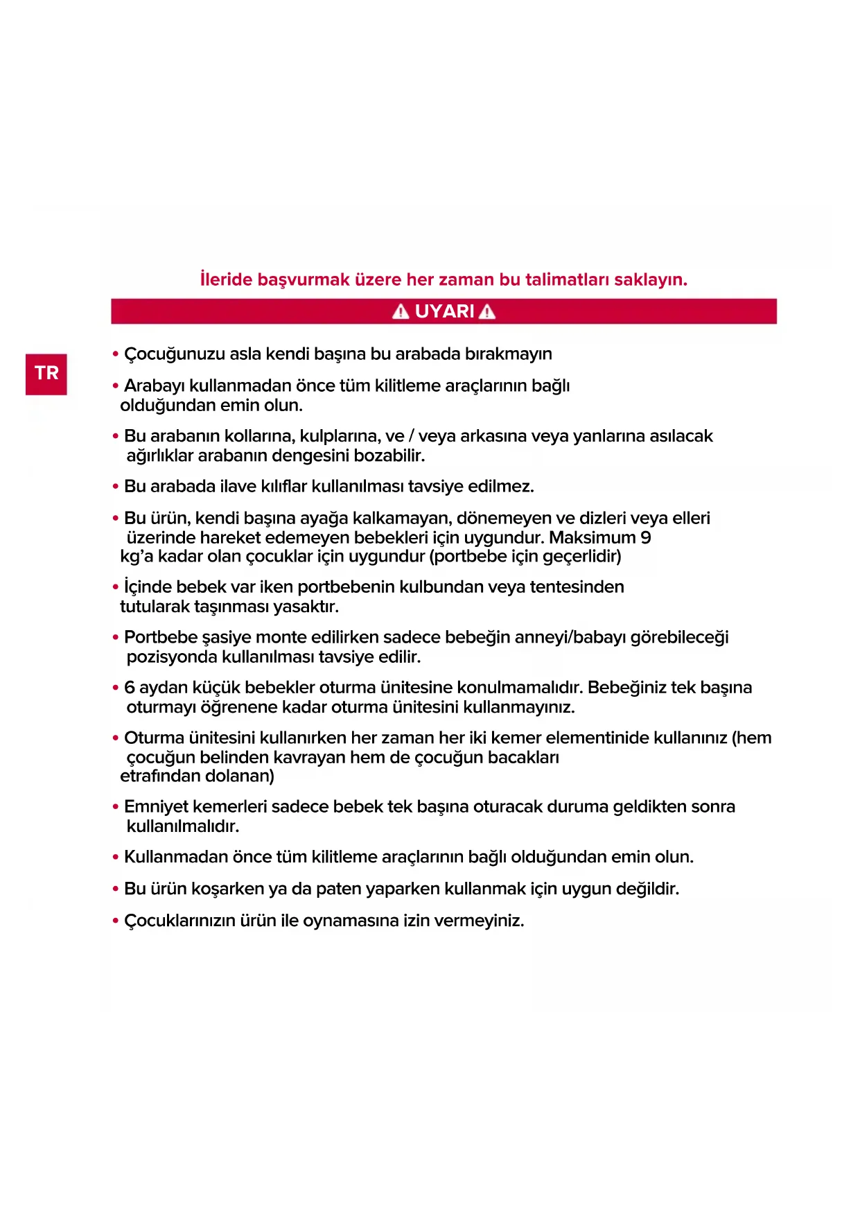 - Bu ürünü kullanmadan önce portbebe, oturma ünitesi ya da araç koltuğu için doğru kilitleme sistemlerinin kullanıldığından emin olunuz. Kullanmadan önce talimatları dikkatli biçimde okuyun ve ileride başvurmak üzere saklayın Bu talimatlara uymamak çocuğunuzun güvenliğini tehlikeye sokar. Bu bebek arabası üzerinde sadece bir adet çocuk taşımak için tasarlanmıştır. Bu bebek arabası 15 Kg’a kadar olan, 0 ila 36 ay arasındaki çocuklar için tasarlanmıştır. Ana kucağı 13 Kg’a kadar olan, 0 ila 36 ay arasındaki çocuklar için kullanılabilir. Kendi başına oturamayan, dönemeyen veya emekleyemeyen bebekler için uygundur. Unutulmamalıdır ki, eğer ana kucağı şasiye monte edilerek kullanılacaksa bebek arabası beşik ya da yatak yerine geçmez; eğer bebeğiniz uyumak isterse onu uygun bir yatak ya da beşiğe yatırmalısınız. Bu bebek arabasını üzerinde bir bebek varken (frenler kilitli dahi olsa) eğimli bir yüzeyde bırakmak kesinlikle yasaktır. Çocuğunuzu arabaya koyarken ya da alırken fren sistemleri kilitlenmelidir. Parçaları arızalı ya da hatalı olması durumunda bu bebek arabasının kullanımı yasaktır. Bu bebek arabasının kurulumuna başlamadan önce ürünün ve parçalarının kusursuz olduğunu kontrol ediniz; eğer bir kusur tespit edilirse ürün kullanılamaz. Bu bebek arabasını ayarlarken, hareket eden parçalarının çocuğunuza değmediğinden emin olunuz. Her durduğunuzda frenleri kilitlemek mecburidir. Tutma kolu için azami yük 1 kg, sepet için ise 2kg.dır. Ağır bir çanta veya herhangi başka ağır bir nesne bebek arabasının dengesini bozar. Sadece üretici onaylı aksesuarları kullanınız. Sadece üretici veya distribütör tarafından temin edilen ya da tavsiye edilen yedek parçaları kullanınız. Bir basamak ya da kaldırımın köşesinden geçmeniz gerekirse bebek arabanızın ön tekerlerini yukarı kaldırınız. Bu bebek arabasını merdiven aşağı kullanmanız tavsiye edilmez. İçinde bebek varken bu bebek arabasını merdiven aşağı veya yukarı kullanmayınız. Lastik basıncı her zaman 0.8 bar’ın altında olmalıdır. Şasi portbebe, oturma ünitesi veya ana kucağı ile birlikte kullanılabilir. Bu bebek arabası çocukların ulaşamayacağı yerlerde saklanmalıdır.