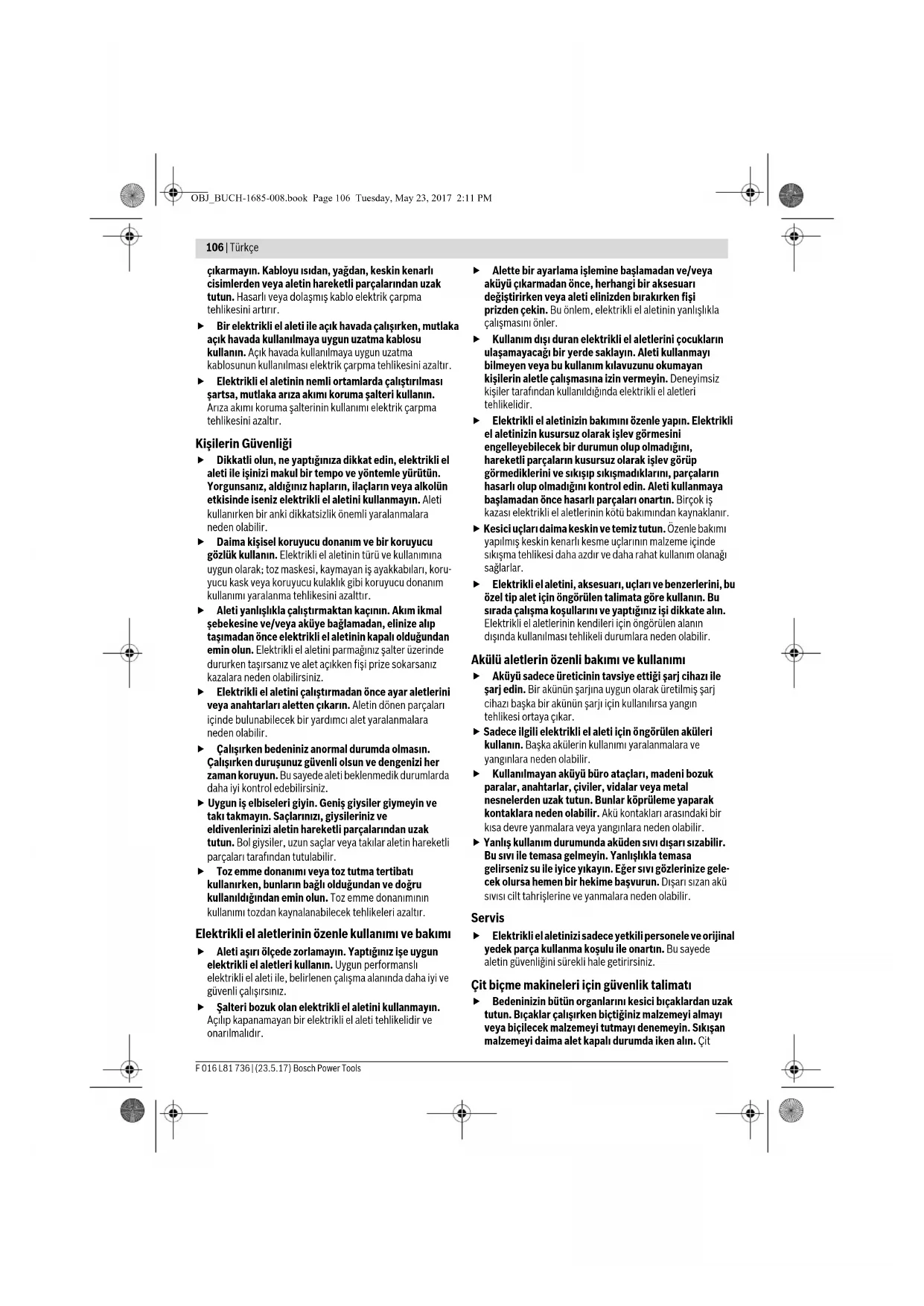 Μην ρίξετε τα μηχανήματα κήπου, τους φορτιστές και τις μπαταρίες στα απορρίμματα του σπιτιού σας! Μόνο για χώρες της ΕΕ: Σύμφωνα με την Κοινοτική Οδηγία 2012/19/EE οι άχρηστες ηλεκτρικές και ηλεκτρονικές συσκευές και σύμφωνα με την Κοινοτική Οδηγία 2006/66/EΚ οι χαλασμένες ή αναλωμένες μπαταρίες δεν είναι πλέον υποχρεωτικό να συλλέγονται ξεχωριστά για να ανακυκλωθούν με τρόπο φιλικό προς το περιβάλλον. Μπαταρίες/Επαναφορτιζόμενες μπαταρίες: Μπαταρίες ιόντων λιθίου: Παρακαλούμε δώστε προσοχή στο κεφάλαιο «Μεταφορά». Τηρούμε το δικαίωμα αλλαγών. Türkçe Güvenlik Talimatı Resimli semboller hakkında açıklamalar Kullanım kılavuzunu tam olarak okuyun. Elektrikli el aletini yağmura karşı koruyun. Bahçe aletinde ayarlama veya temizlik işleri yapmadan önce ve bahçe aletini uzun süre denetim dışı bırakacağınız zaman aküyü çıkarın. Elektrikli El Aletleri İçin Genel Uyarı Talimatı Bütün uyarıları ve talimat hükümlerini okuyun. Açıklanan uyarılara ve talimat hüküm- lerine uyulmadığı takdirde elektrik çarpmalarına, yangınlara ve/veya ağır yaralanmalara neden olunabilir. Bütün uyarıları ve talimat hükümlerini ileride kullanmak üzere saklayın. Uyarı ve talimat hükümlerinde kullanılan “Elektrikli El Aleti” kavramı, akım şebekesine bağlı (şebeke bağlantı kablosu ile) aletlerle akü ile çalışan aletleri (akım şebekesine bağlantısı olmayan aletler) kapsamaktadır. Çalışma yeri güvenliği Çalıştığınız yeri temiz tutun ve iyi aydınlatın. Çalıştığınız yer düzensiz ise ve iyi aydınlatılmamışsa kazalar ortaya çıkabilir. Yakınında patlayıcı maddeler, yanıcı sıvı, gaz veya tozların bulunduğu yerlerde elektrikli el aleti ile çalışmayın. Elektrikli el aletleri, toz veya buharların tutuş- masına neden olabilecek kıvılcımlar çıkarırlar. Elektrikli el aleti ile çalışırken çocukları ve başkalarını uzakta tutun. Dikkatiniz dağılacak olursa aletin kontrolünü kaybedebilirsiniz. Elektrik Güvenliği Elektrikli el aletinin bağlantı fişi prize uymalıdır. Fişi hiçbir zaman değiştirmeyin. Koruyucu topraklanmış elektrikli el aletleri ile birlikte adaptör fiş kullanmayın. Değiştirilmemiş fiş ve uygun priz elektrik çarpma tehlikesini azaltır. Borular, kalorifer petekleri, ısıtıcılar ve buzdolapları gibi topraklanmış yüzeylerle bedensel temasa gelmekten kaçının. Bedeniniz topraklandığı anda büyük bir elektrik çarpma tehlikesi ortaya çıkar. Aleti yağmur altında veya nemli ortamlarda bırakmayın. Suyun elektrikli el aleti içine sızması elektrik çarpma tehlikesini artırır. Elektrikli el aletini kablosundan tutarak taşımayın, kabloyu kullanarak asmayın veya kablodan çekerek fişi UYARI OBJ_BUCH-1685-008.book Page 105 Tuesday, May 23, 2017 2:11 PM106 | Türkçe F 016 L81 736 | (23.5.17) Bosch Power Tools çıkarmayın. Kabloyu ısıdan, yağdan, keskin kenarlı cisimlerden veya aletin hareketli parçalarından uzak tutun. Hasarlı veya dolaşmış kablo elektrik çarpma tehlikesini artırır. Bir elektrikli el aleti ile açık havada çalışırken, mutlaka açık havada kullanılmaya uygun uzatma kablosu kullanın. Açık havada kullanılmaya uygun uzatma kablosunun kullanılması elektrik çarpma tehlikesini azaltır. Elektrikli el aletinin nemli ortamlarda çalıştırılması şartsa, mutlaka arıza akımı koruma şalteri kullanın. Arıza akımı koruma şalterinin kullanımı elektrik çarpma tehlikesini azaltır. Kişilerin Güvenliği Dikkatli olun, ne yaptığınıza dikkat edin, elektrikli el aleti ile işinizi makul bir tempo ve yöntemle yürütün. Yorgunsanız, aldığınız hapların, ilaçların veya alkolün etkisinde iseniz elektrikli el aletini kullanmayın. Aleti kullanırken bir anki dikkatsizlik önemli yaralanmalara neden olabilir. Daima kişisel koruyucu donanım ve bir koruyucu gözlük kullanın. Elektrikli el aletinin türü ve kullanımına uygun olarak; toz maskesi, kaymayan iş ayakkabıları, koru- yucu kask veya koruyucu kulaklık gibi koruyucu donanım kullanımı yaralanma tehlikesini azalttır. Aleti yanlışlıkla çalıştırmaktan kaçının. Akım ikmal şebekesine ve/veya aküye bağlamadan, elinize alıp taşımadan önce elektrikli el aletinin kapalı olduğundan emin olun. Elektrikli el aletini parmağınız şalter üzerinde dururken taşırsanız ve alet açıkken fişi prize sokarsanız kazalara neden olabilirsiniz. Elektrikli el aletini çalıştırmadan önce ayar aletlerini veya anahtarları aletten çıkarın. Aletin dönen parçaları içinde bulunabilecek bir yardımcı alet yaralanmalara neden olabilir. Çalışırken bedeniniz anormal durumda olmasın. Çalışırken duruşunuz güvenli olsun ve dengenizi her zaman koruyun. Bu sayede aleti beklenmedik durumlarda daha iyi kontrol edebilirsiniz. Uygun iş elbiseleri giyin. Geniş giysiler giymeyin ve takı takmayın. Saçlarınızı, giysileriniz ve eldivenlerinizi aletin hareketli parçalarından uzak tutun. Bol giysiler, uzun saçlar veya takılar aletin hareketli parçaları tarafından tutulabilir. Toz emme donanımı veya toz tutma tertibatı kullanırken, bunların bağlı olduğundan ve doğru kullanıldığından emin olun. Toz emme donanımının kullanımı tozdan kaynalanabilecek tehlikeleri azaltır. Elektrikli el aletlerinin özenle kullanımı ve bakımı Aleti aşırı ölçede zorlamayın. Yaptığınız işe uygun elektrikli el aletleri kullanın. Uygun performanslı elektrikli el ale