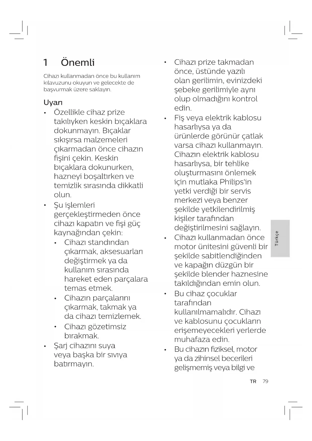 Fiş veya elektrik kablosu hasarlıysa ya da ürünlerde görünür çatlak varsa cihazı kullanmayın. Cihazın elektrik kablosu hasarlıysa, bir tehlike oluşturmasını önlemek için mutlaka Philips'in yetki verdiği bir servis merkezi veya benzer şekilde yetkilendirilmiş kişiler tarafından değiştirilmesini sağlayın.